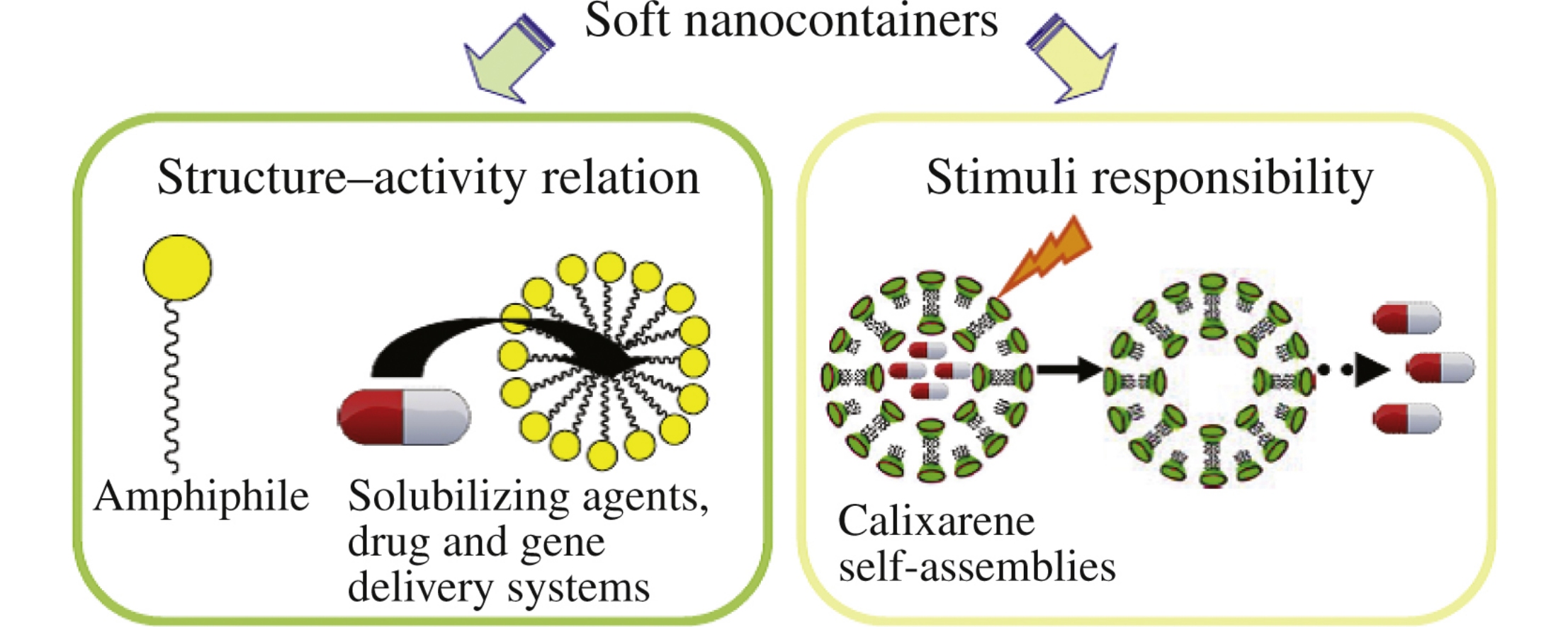 Organized systems based on amphiphiles are discussed from the viewpoint of their application as solubilizing agents and drug and gene delivery systems with structure–activity relationships and stimuli responsibility emphasized. Special attention is paid to cationic surfactants, including gemini and naturally originated compounds. Practically important lipid formulations, i.e., liposomes and solid lipid nanoparticles, are discussed in terms of their stability, loading capacity, surface modification and therapeutic efficacy. The stimuli responsibility of formulations is analyzed and exemplified by smart supramolecular systems based on a calixarene platform.