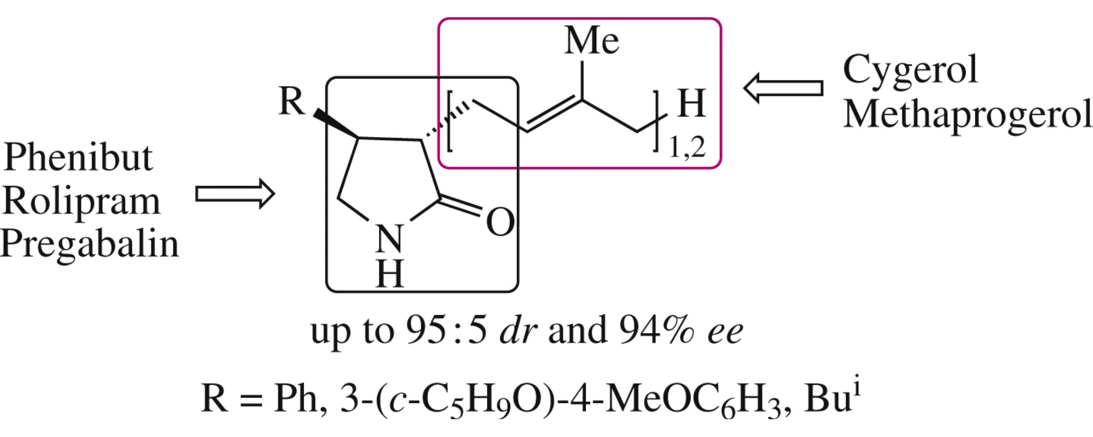 Pharmacology-relevant compounds bearing structural fragments of racetam nootropics, wound-healing acyclic isoprenoids and neurotropic GABA analogues, were enantioselectively (up to 94% ee) synthesized from available and inexpensive precursors.