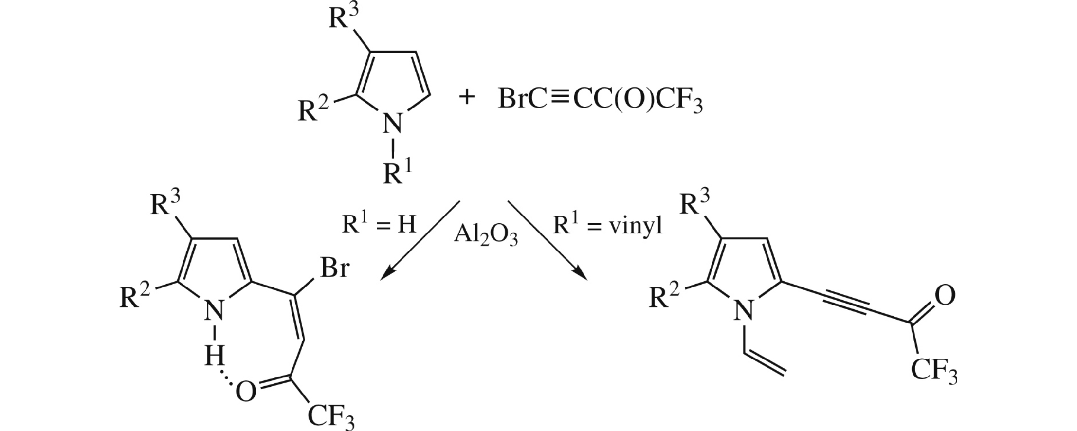 Cross-coupling of NH-pyrroles with 1-bromo-2-(trifluoroacetyl) acetylene in the Al2O3 medium affords (E)-4-bromo-1,1,1-trifluoro-4-(pyrrol-2-yl)but-3-en-2-ones instead of the expected 2-ethynylated products. Quantum-chemical analysis shows strong intramolecular hydrogen bonding between NH and trifluoroacetyl groups, higher NH acidity and deeper charge transfer to the ethenyl moiety, which determines the reaction pathway.