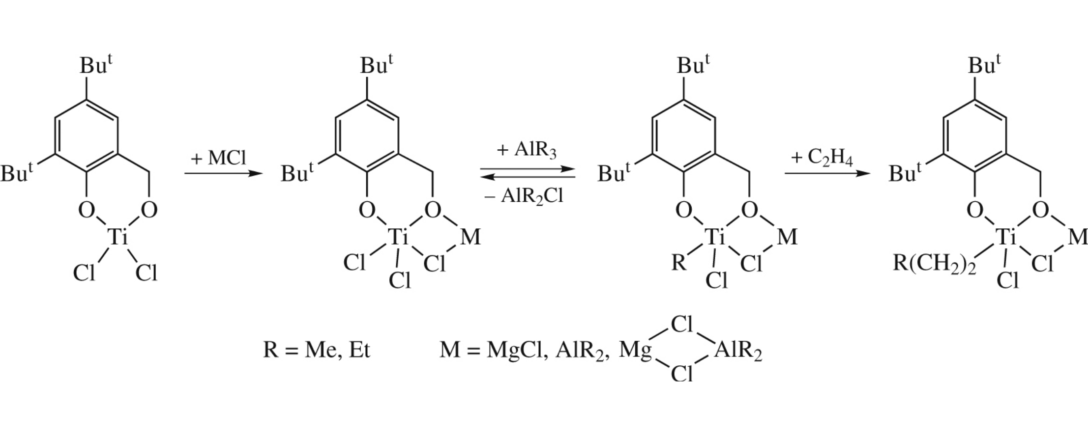 The quantum-chemical modeling of post-titanocene catalytic systems for alkene polymerization suggests that the activation effect of Mg-containing compounds in alkene polymerization can be caused by a greater exothermicity of Cl ligand exchange in bi- and trinuclear heterocomplexes of Ti, Mg and Al for the alkyl group of AlR3 with respect to a Ti complex and their higher stability and reactivity toward alkenes, as compared to Ti and Al compounds formed in the Mg-free system.