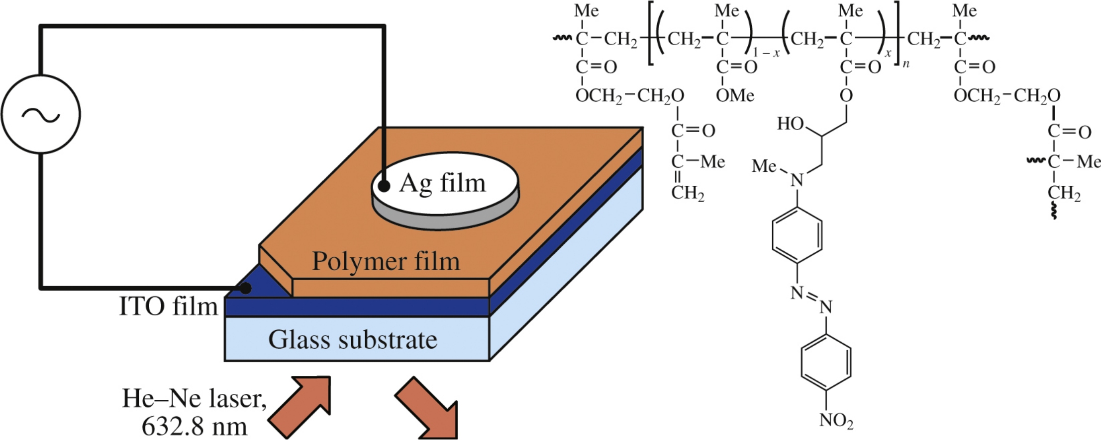 The electro-optic coefficients of 20, 33 and 21 pm V–1 for branched methacrylic copolymers FI, FII and FIII, respectively, with different chromophore contents were determined by a Teng–Man ellipsometric technique.