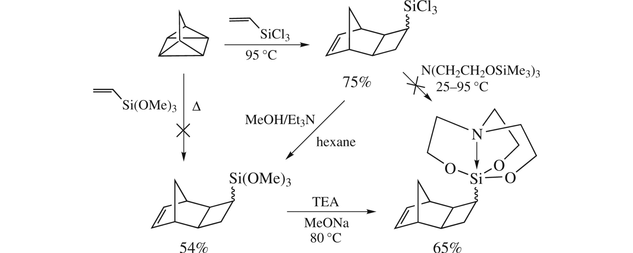 Consequitive treatment of quadricyclane with trichlorovinylsilane and methanol affords 3-trimethoxysilyltricyclo[4.2.1.02,5]non-7-ene which on reaction with triethanolamine gives a new silatrane promising as a gas separation membrane material.