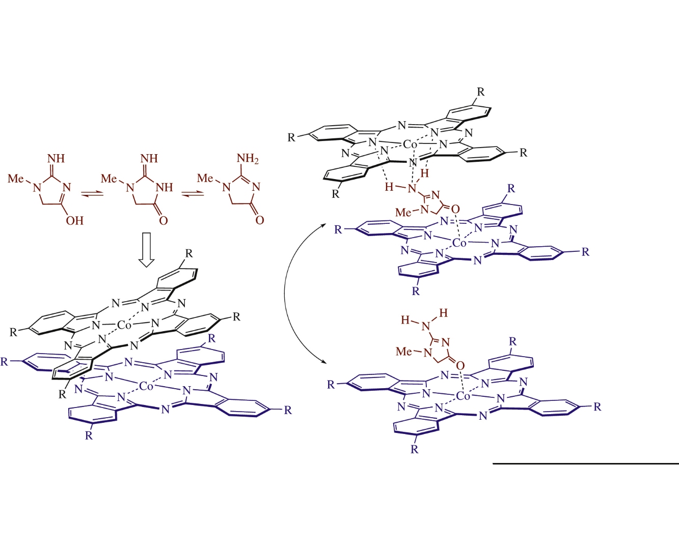 Sulfonated derivatives of cobalt phthalocyanine strongly fix the creatinine (2-amino-1-methyl-1H-imidazol-4-ol) thus forming ordered dimeric structures. Such bonding may be used to create materials for sorption of creatinine from the solutions and to form direct liquid-phase systems based on metal phthalocyanines.