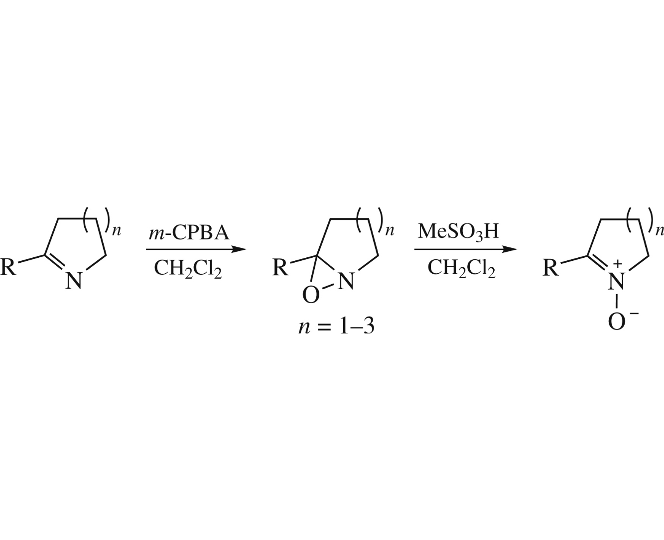 Treatment of 5-, 6- and 7-membered cyclic ketimines bearing alkyl or aryl group with m-chloroperbenzoic acid proceeds as C=N epoxidation and affords bicyclic oxaziridines in good yields, whose subsequent rearrangement gives nitrones.