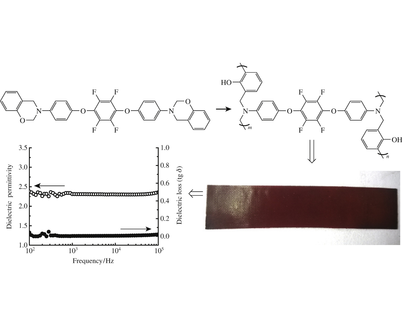 Cross-linked polybenzoxazine with substantially reduced dielectric constant and loss factor (2.3 and 0.0041 at 10kHz, respectively) based on a novel core-fluorinated bis(benzoxazine)-containing monomer with 1,4-tetrafluorobenzene dioxyphenylene central unit was prepared. Herewith, this fluorinated polybenzoxazine possesses low water absorption (0.5%) and high degree of cross-linking (98.5%).