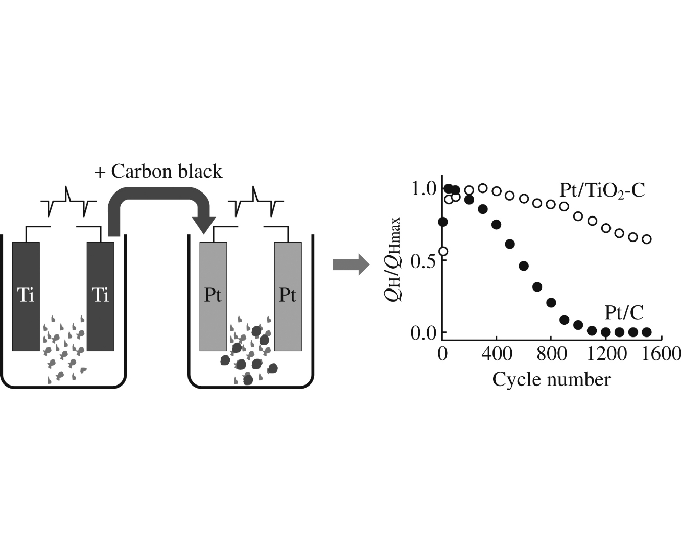 The Pt/TiO2-C catalysts with different TiO2 loadings have been prepared by electrochemical oxidation/dispersion, and their good catalytic activity in CO stripping and methanol electrooxidation reactions has been shown.