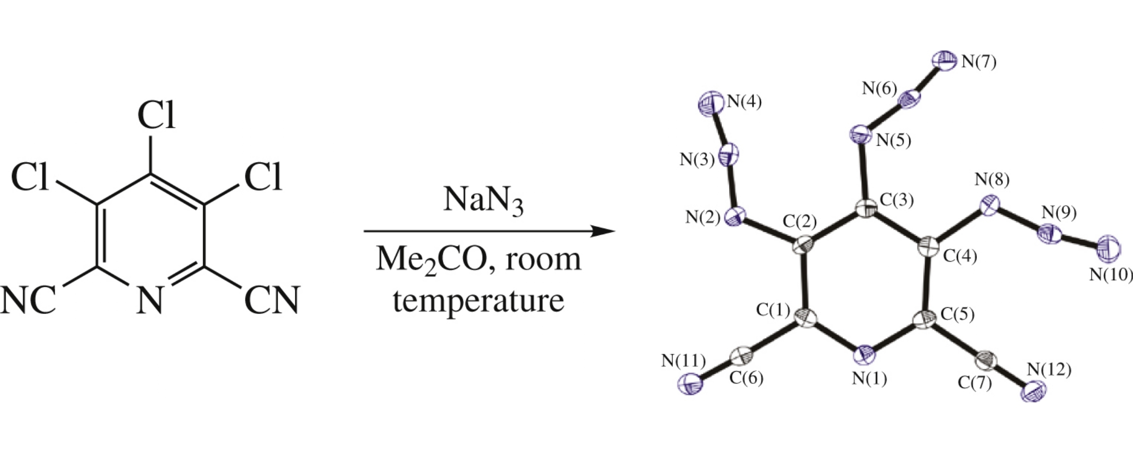 3,4,5-Triazidopyridine-2,6-dicarbonitrile, the first aromatic triazide with three adjacent azido groups in the ring, possessing the record positive heat of formation, was synthesized by azidation of 3,4,5-trichloropyridine-2,6-dicarbonitrile and characterized with X-ray analysis, thermogravimetry, differential scanning calorimetry and spectroscopic methods.