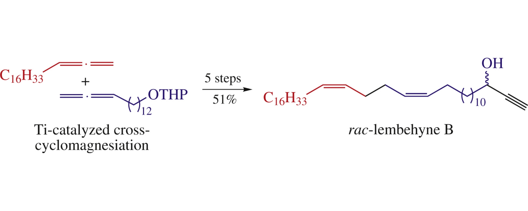 The total synthesis of lembehyne B was accomplished in five steps in 51% total yield. The cross-cyclomagnesiation of two allenic components, nonadeca-1,2-diene and pentadeca-13,14-dien-1-ol tetrahydropyranyl ether, with EtMgBr in the presence of Mg and Cp2TiCl2 catalyst (10 mol%) was used in the key step of the synthesis.