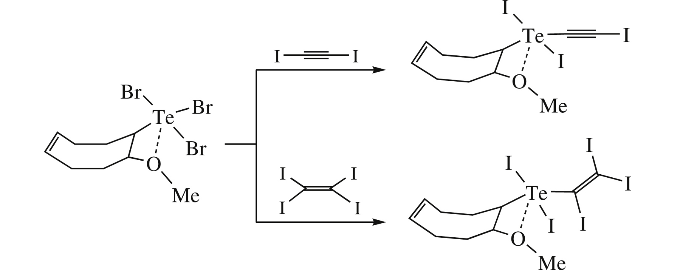Unusual substitution of bromine atoms in organotellurium tribromide with 1,2-diiodoethyne and 1,1,2,2-tetraiodoethene and addition of diphenyl ditelluride to the triple bond of 1,2-diiodoethyne, is reported. In the solid state, halogen and chalcogen bonds assist self-assembly of the resulting molecules.