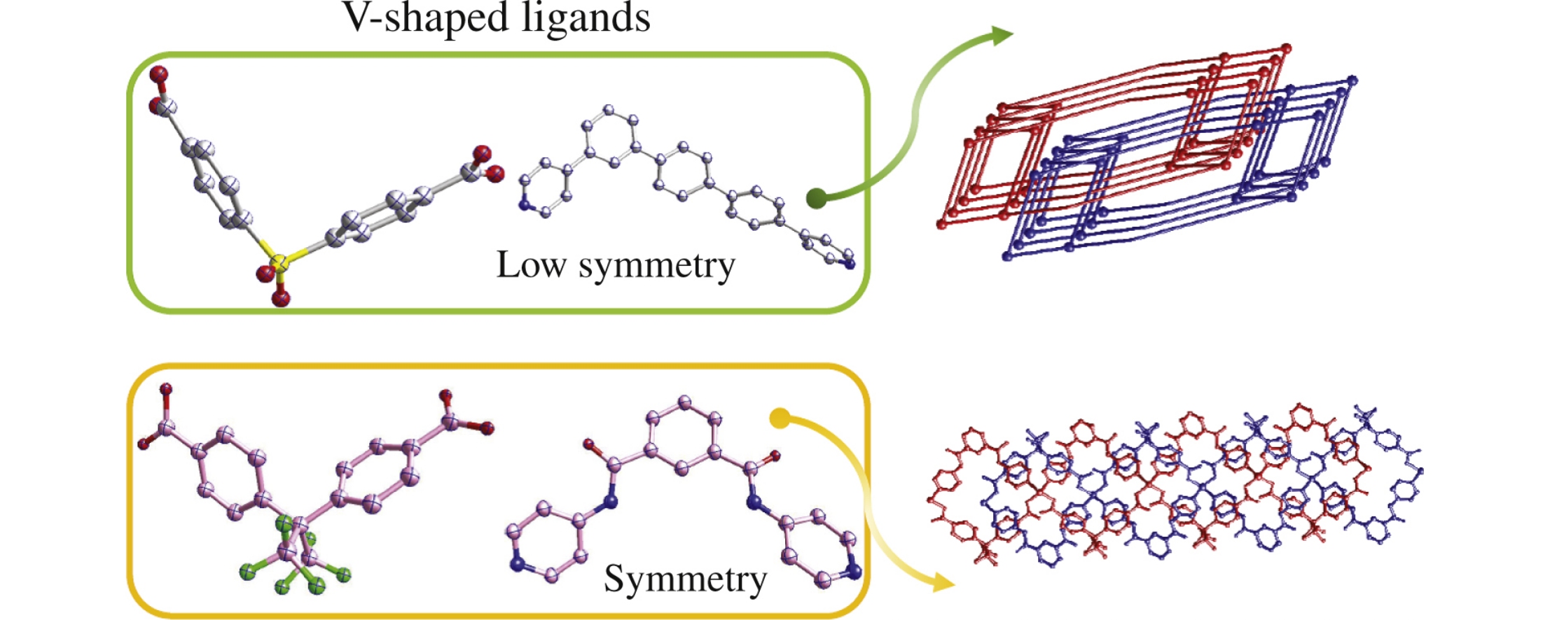 Two new coordination compounds with various parallel interpenetration forms {[Cd(L1)(sdb)·H2O]}n and {[Zn(L2)(hfipbb)]·H2O}n {L1 = N,N′-bis(4-pyridyl)isophthalamide, L2 = 4,4′-([1,1′:4′,1′′-terphenyl]-3,4′′-diyl)dipyridine, H2hfipbb = 4,4′-(hexafluoroisopropylidene) bis(benzoic acid), 4,4’-sdb = 4,4’-sulfonyl dibenzoate} have been synthesized based on two V-shaped pyridine ligands, that is, symmetrical L1 and unsymmetrical L2 ones. The compounds were characterized by elemental analyses and single crystal X-ray diffraction studies.