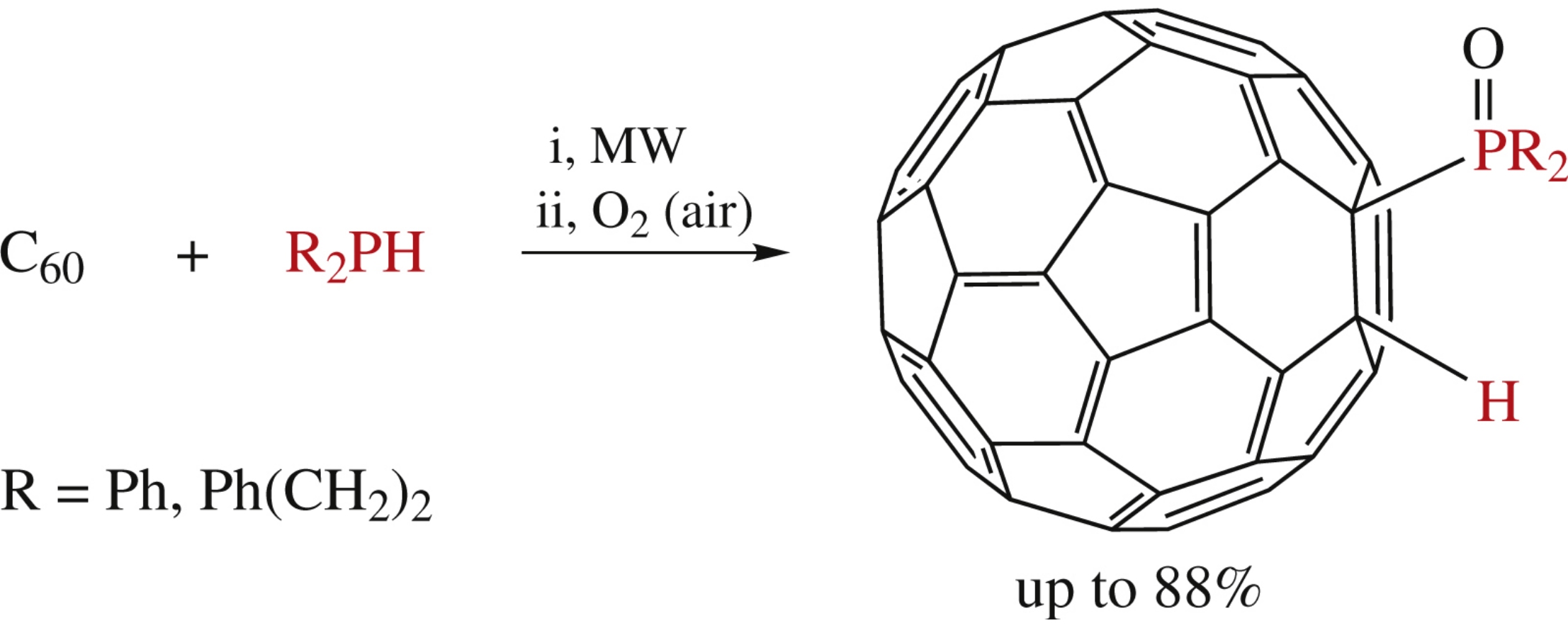 Secondary phosphines, R2PH (R = Ph, PhCH2CH2), react with fullerene C60 under microwave irradiation at 200–270°C for 1–2 h in the medium of substituted naphthalenes (1-Cl, 1-Me, 1-MeO) or without solvent to afford mono-adducts, HC60PR2, whose air oxidation gives the corresponding phosphine oxides, HC60P(O)R2, in up to 88% yield.