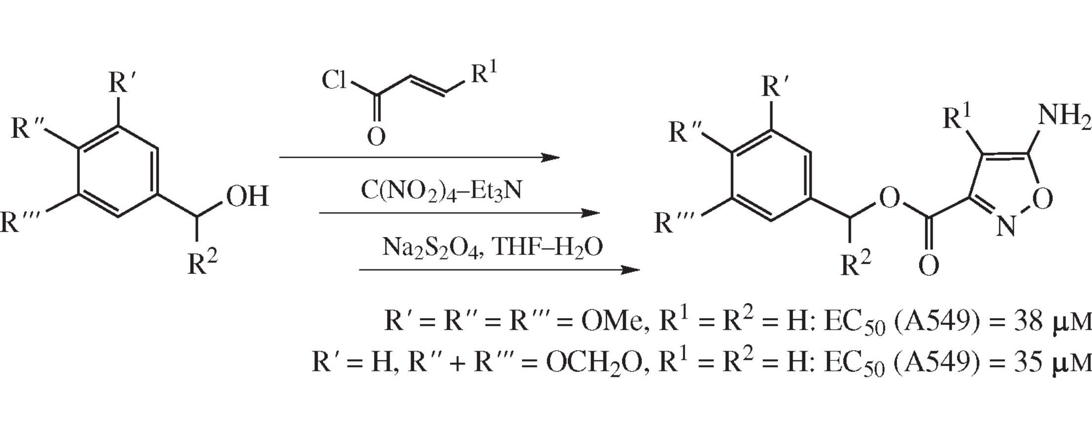 5-Aminoisoxazoles containing trimethoxy- and methylenedioxyphenyl moieties were prepared by heterocyclization of electrophilic alkenes with tetranitromethane in the presence of triethylamine with subsequent reduction of resulting 5-nitroisoxazoles. The crystal structure of 3,4,5-trimethoxybenzyl 5-aminoisoxazole-3-carboxylate was determined by X-ray analysis. Two novel 5-aminoisoxazoles demonstrated moderate antimitotic activity to human lung carcinoma A549 cell line.