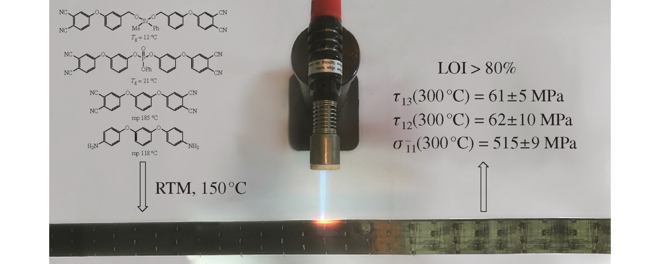 Carbon fiber reinforced phthalonitriles obtained by resin transfer molding have been reported for the first time. Special formulation based on silicon-and phosphorus-containing phthalonitrile monomers has been developed to yield a composite with retention of mechanical properties at 300 °C and remarkable flame-retardant properties (LOI > 80%).