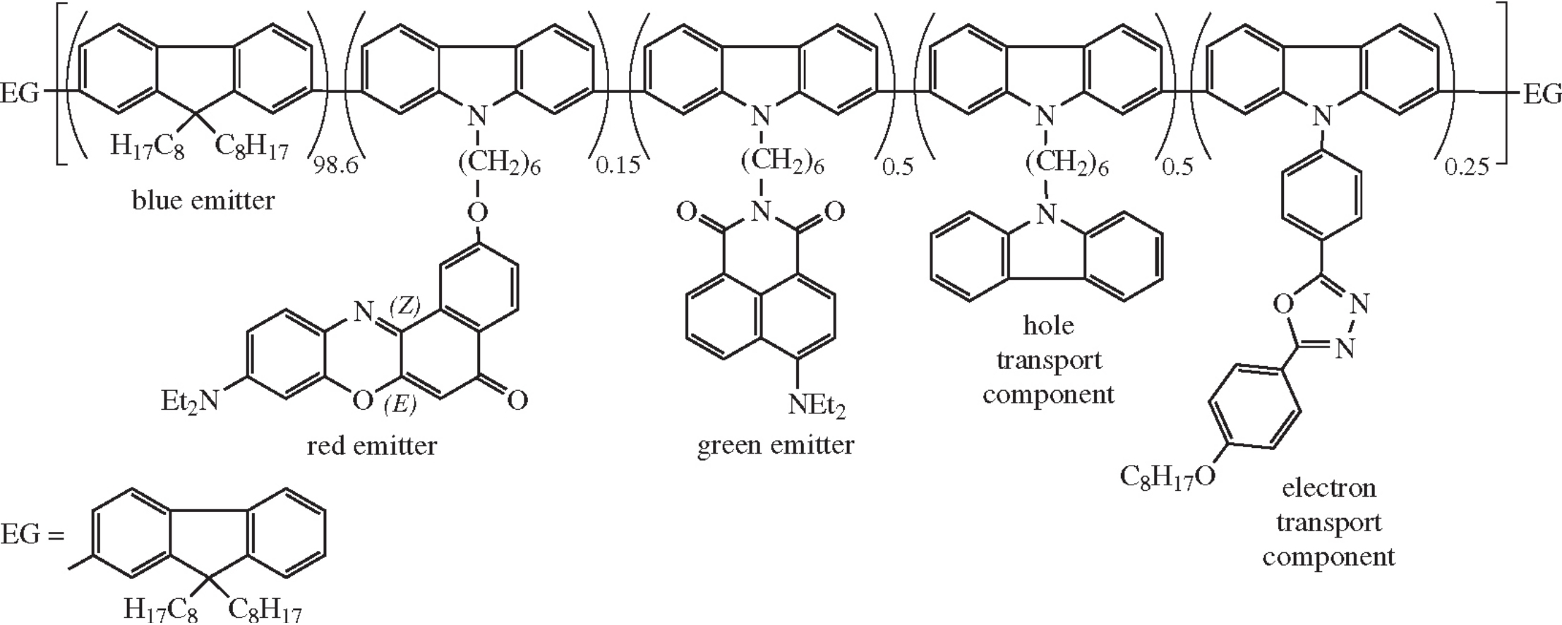 Seven polyfluorenes containing new carbazole derivatives of Nile Red dye and 1,8-naphthalimide in the chain (obtained by the Suzuki and Yamamoto coupling) are characterized by the Nile Red emission band being less intense in their electroluminescence spectra than in photoluminescence spectra. In the optimal composition, 0.15 mol% fraction of Nile Red and 0.5 mol% fraction of N-[6-(2,7-dibromocarbazol-9-yl)hexyl]-4-diethylamino-1,8-naphthalimide provide a nearly white light electroluminescence (CIE coordinates x = 0.28; y = 0.36) with the brightness of 3278 cd m–2 and the current efficiency of 1.86 cd A–1.