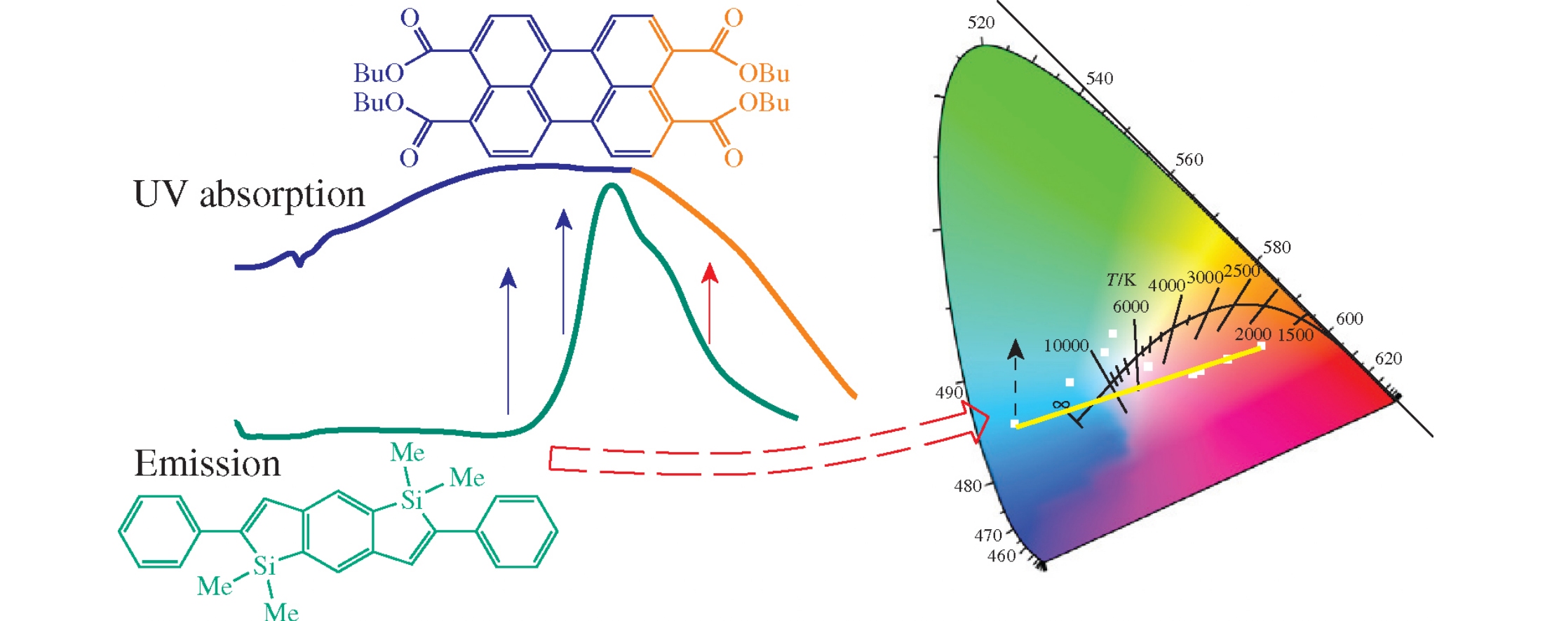 Asymmetric energy transfer in white fluorescent mixtures results in fluorescence peak and color coordinate shift.