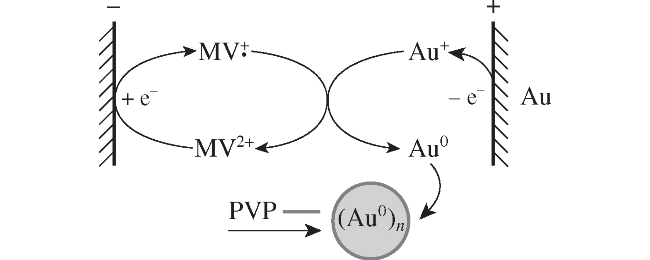 Methylviologen mediated reduction of Aui ions generated in situ by dissolution of a gold anode in single compartment cell has been used for the electrosynthesis of spherical gold nanoparticles (Au-NPs) stabilized by poly(N-vinylpyrrolidone). The size of Au-NPs was from 15±6 to 27±9 nm, depending on the electrosynthesis conditions. Au-NPs were characterized by cyclic voltammetry, UV-VIS spectroscopy, dynamic light scattering, scanning and transmission electron microscopy.