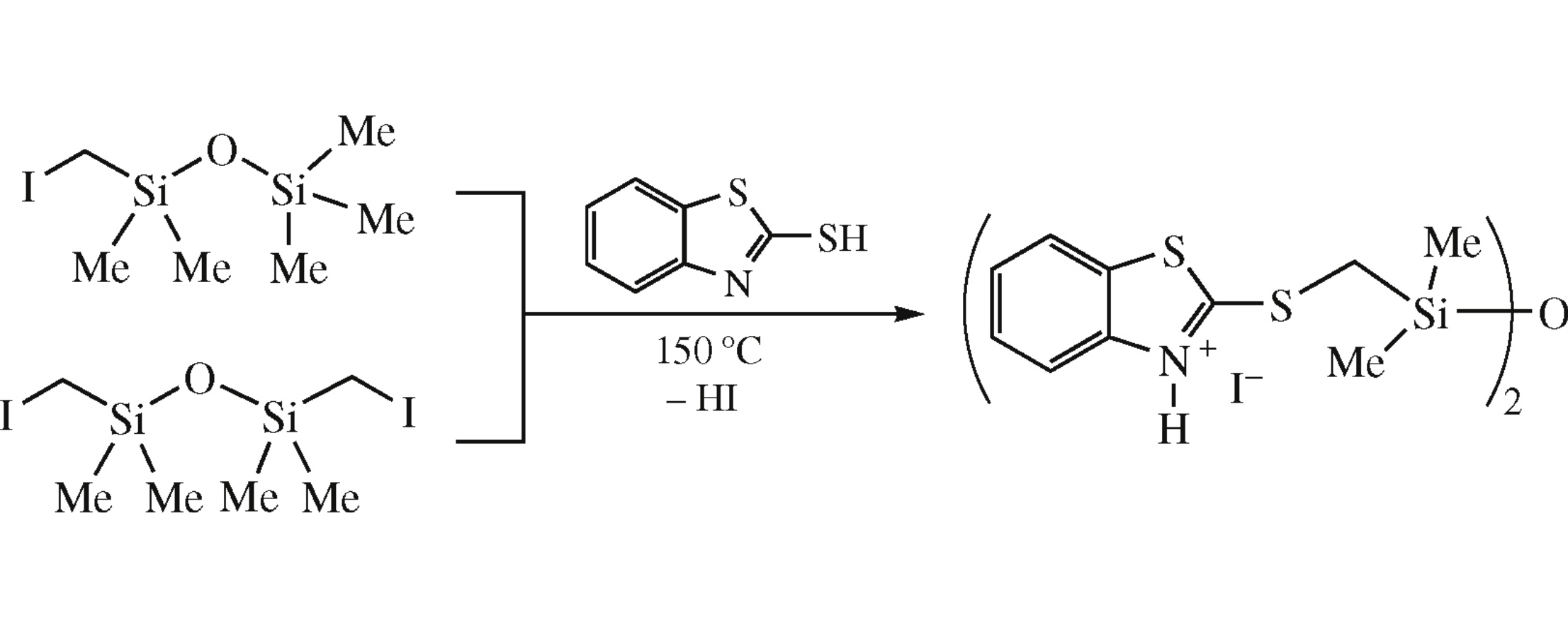 First organosilicon captax derivatives were obtained from 2-mercaptobenzothiazole and 1-(iodomethyl)-1,1,3,3,3-pentamethyl-or 1,3-bis(iodomethyl)-1,1,3,3-tetramethyldisiloxanes in the absence or in the presence of bases.