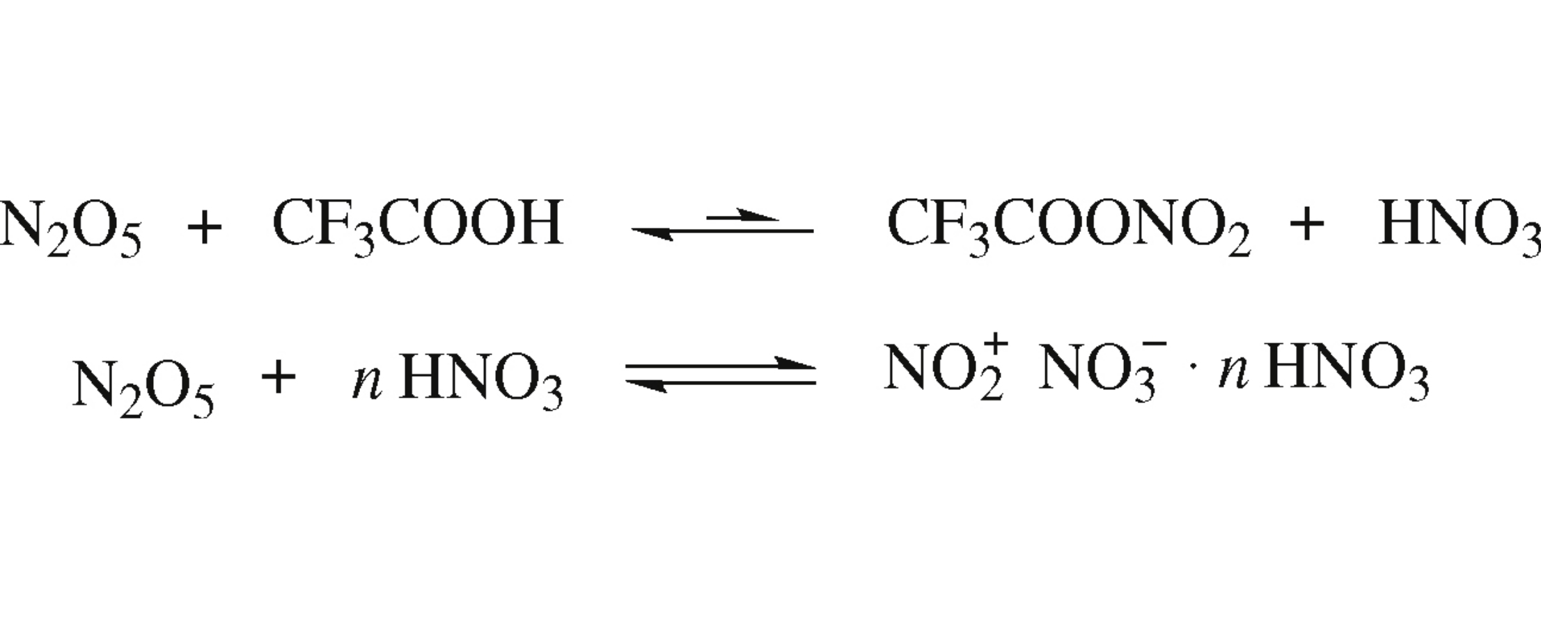 Dinitrogen pentoxide solution in trifluoroacetic acid simultaneously has features of both known types of its interaction with acids, viz. with weak and strong acids. It partially reacts with CF3COOH to give the covalent trifluoroacetyl nitrate and nitric acid, however the major part of N2O5 exists in the covalent form in solution to concurrently produce nitronium ions due to the presence of HNO3. Quantum chemical calculations confirm the equilibrium nature of CF3COOHN2O5 interaction.