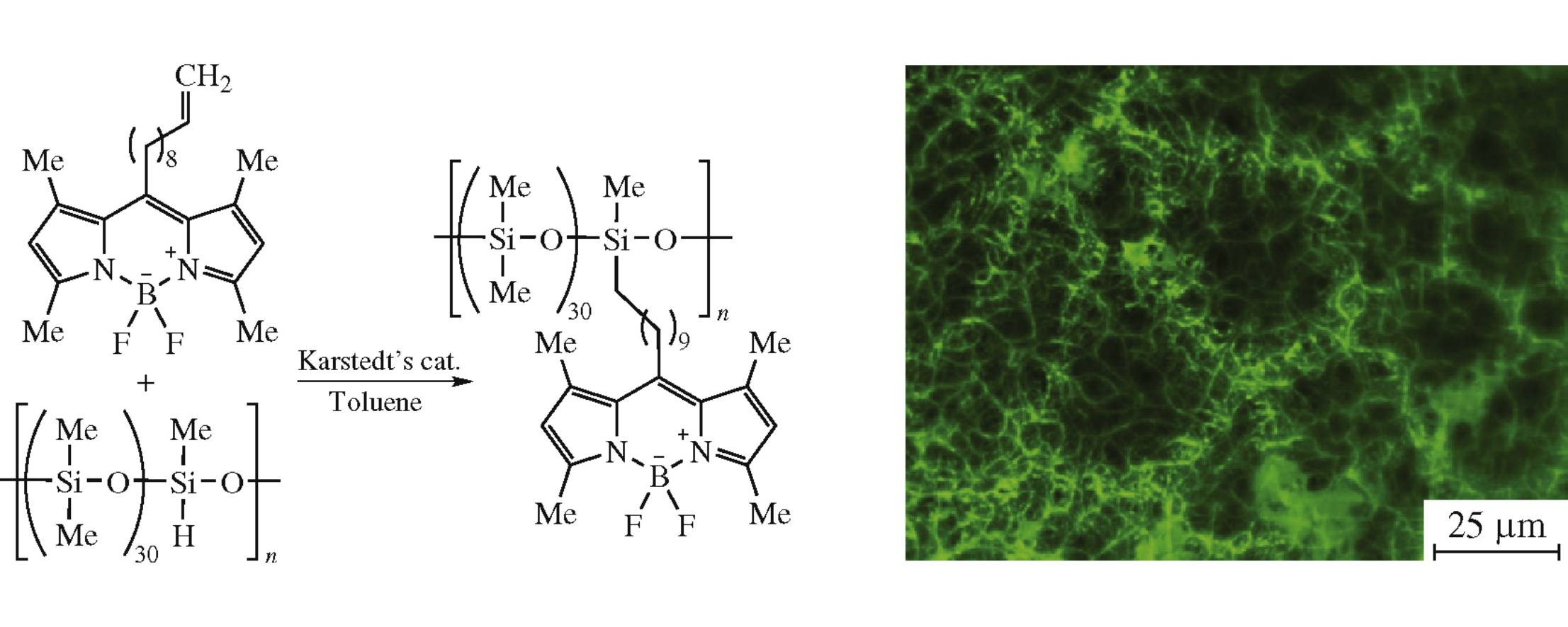 A meso-decene-BODIPY dye was synthesized and conjugated to a polydimethylsiloxane. Fluorescence properties of the obtained polymer drastically changed in different solvents. The polymer showed an unusual for other siloxane polymers trend to structuration.