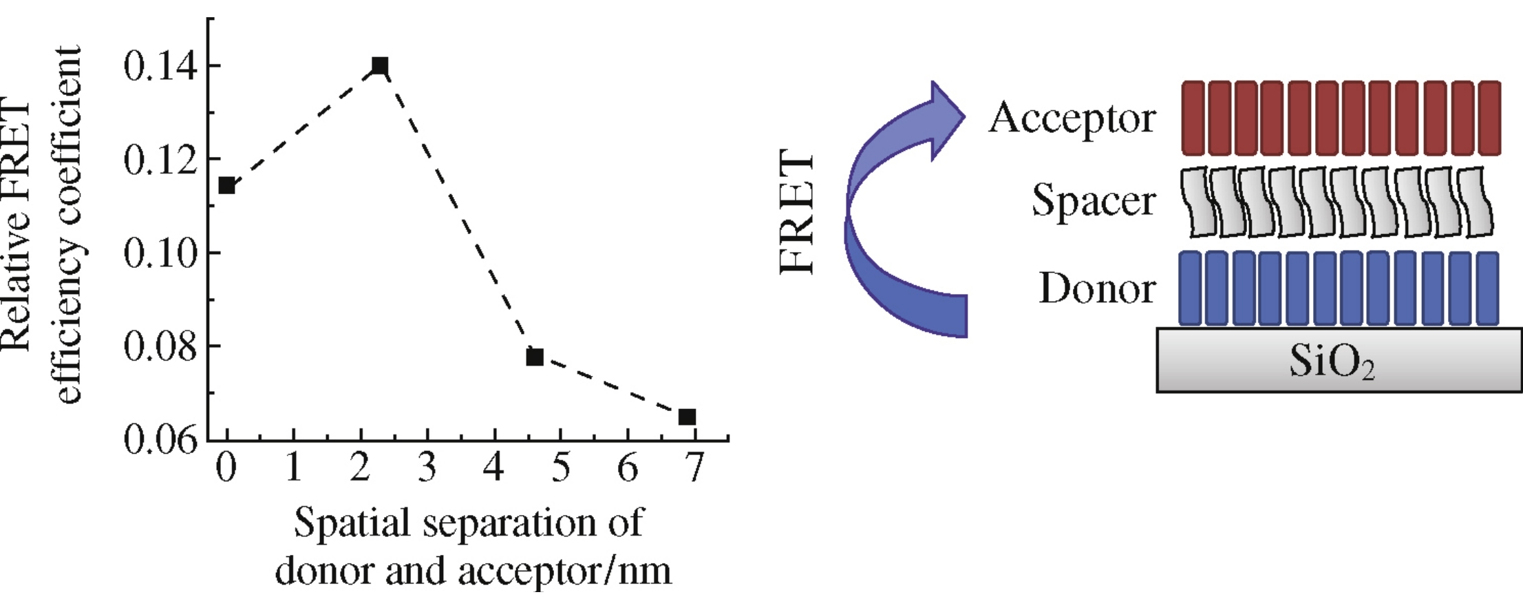 In the multilayer systems where monolayers of donor and acceptor fluorophores of different chemical structure are separated by an inert layer, the dependence of nonradiative energy transfer efficiency on the distance between the planar components of a donor–acceptor couple has a maximum at a finite nonzero thickness of the separating layer.