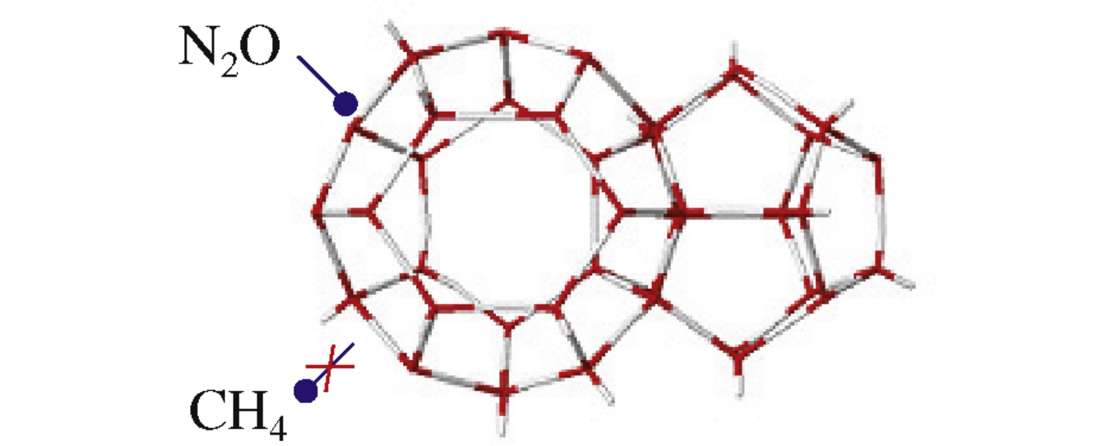 Thermodynamic conditions for the formation of the clathrate hydrates of N2O + CH4 gas mixtures have been determined by computer simulation with special emphasis on the possibility of using hydrates for the storage of greenhouse gases.