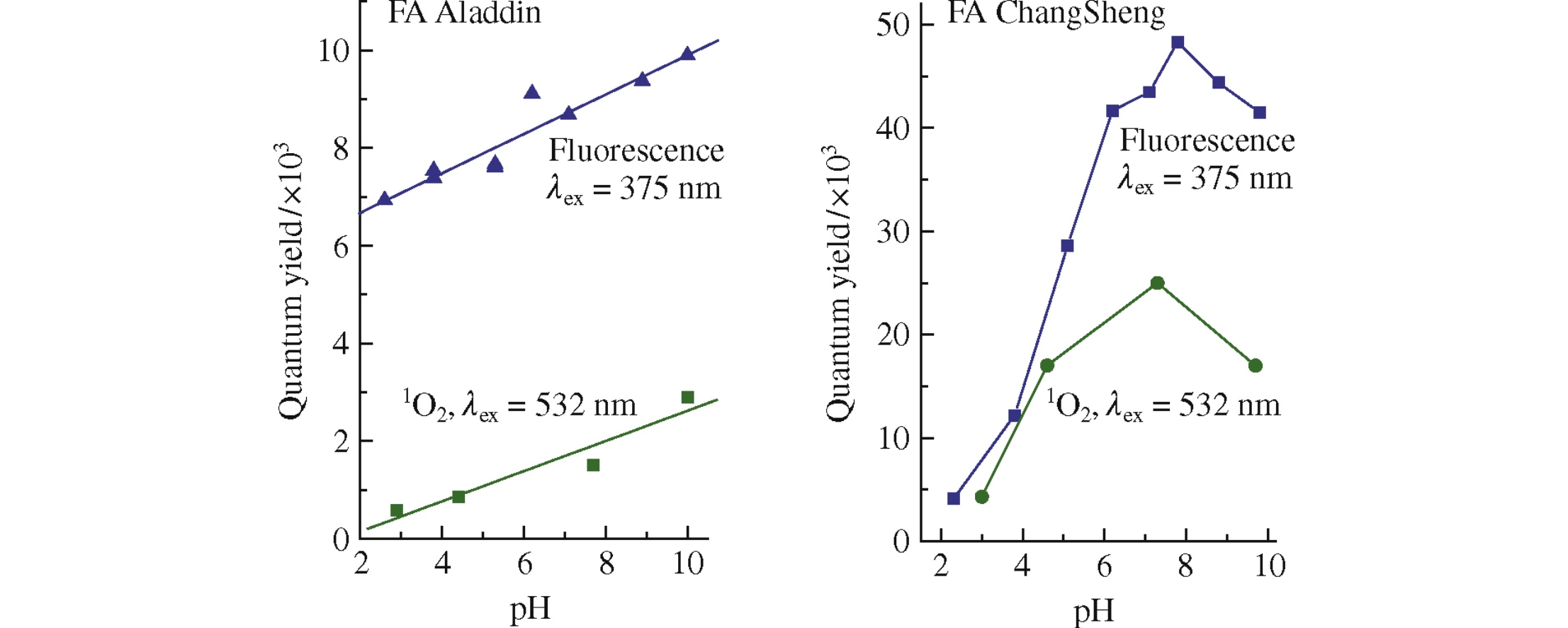 pH-dependent efficiency of singlet oxygen (1O2) generation by fulvic acids (FAs) from different sources was estimated by time-resolved luminescence technique. All FAs turn up the highest quantum yields of 1O2 for neutral and alkali solutions [ϕ532(1O2)] = (0.3•2.5)í10•2] and 3•5-fold decrease in ϕ532(1O2) for acidic solutions. Potential of FA ChangSheng (the best 1O2 generating agent among investigated FAs) in relation to photodegradation of non-UVA-absorbing herbicide Amitrole (3-amino-1,2,4-triazole) was demonstrated.