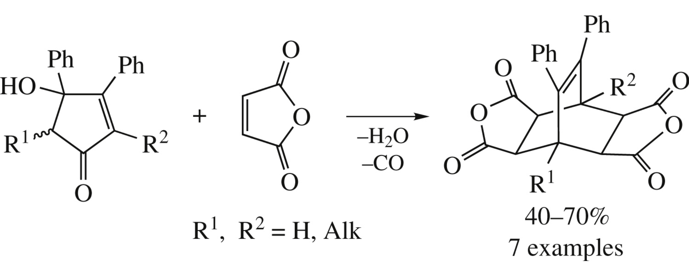 2(5)-Substituted 4-hydroxy-3,4-diphenylcyclopent-2-en-1-ones easily react with 2.5 molar excess of maleic anhydride to give 1(4)-substituted 7,8-diphenylbicyclo[2.2.2]oct-7-ene-2,3,5,6-tetracarboxylic acid dianhydrides containing alkyl groups at bridgehead of the bicycle. The stereochemistry of the obtained bicyclic bis-anhydrides was determined to be syn-syn.