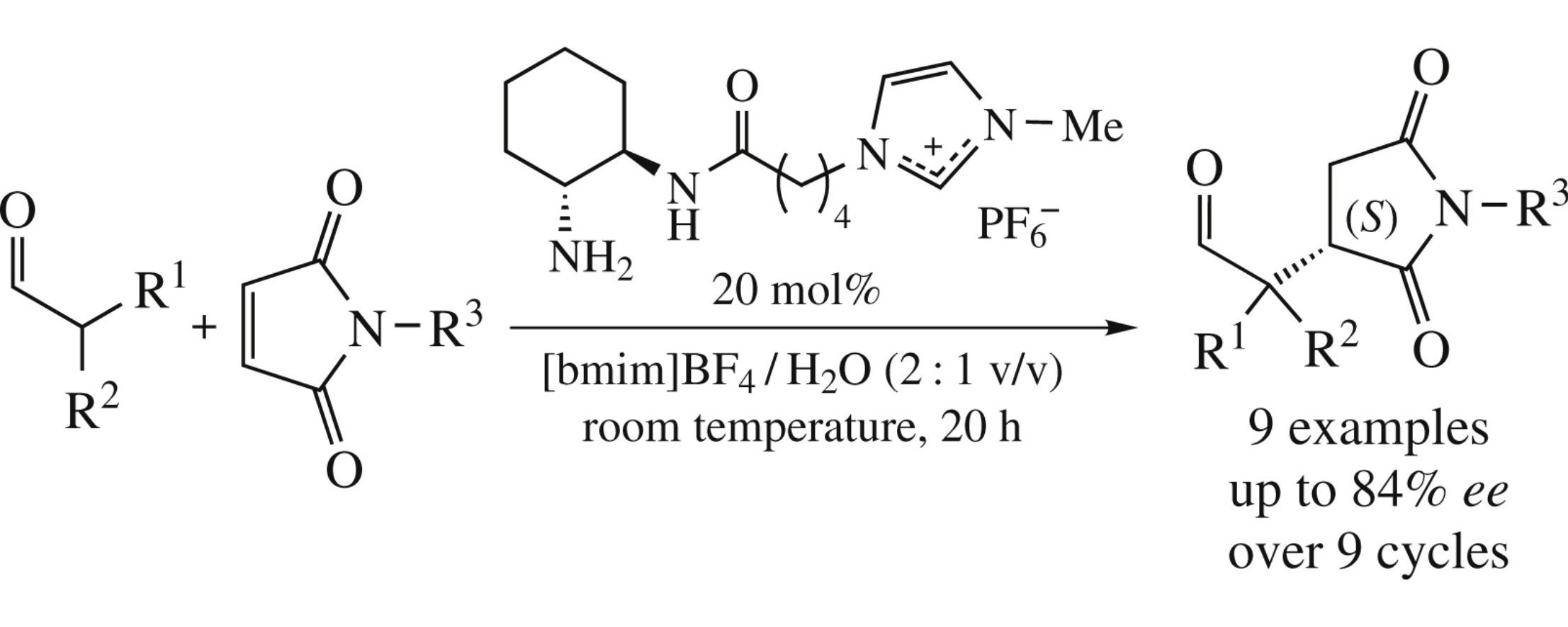 A primary amine-based aqueous ionic liquid-supported recyclable catalytic system for asymmetric Michael addition of aldehydes to maleimides has been developed. The best enantioselectivity (up to 84% ee) was attained at the [bmim]BF4/water 2 : 1 (v/v) ratio.