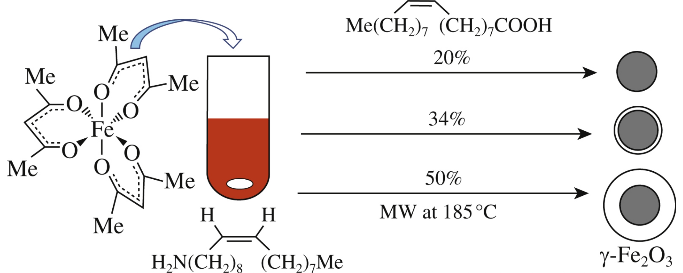 Using microwave-assisted synthesis in organic solution, we produced magnetic γ-Fe2O3 nanoparticles covered with oleylamine and oleic acid.