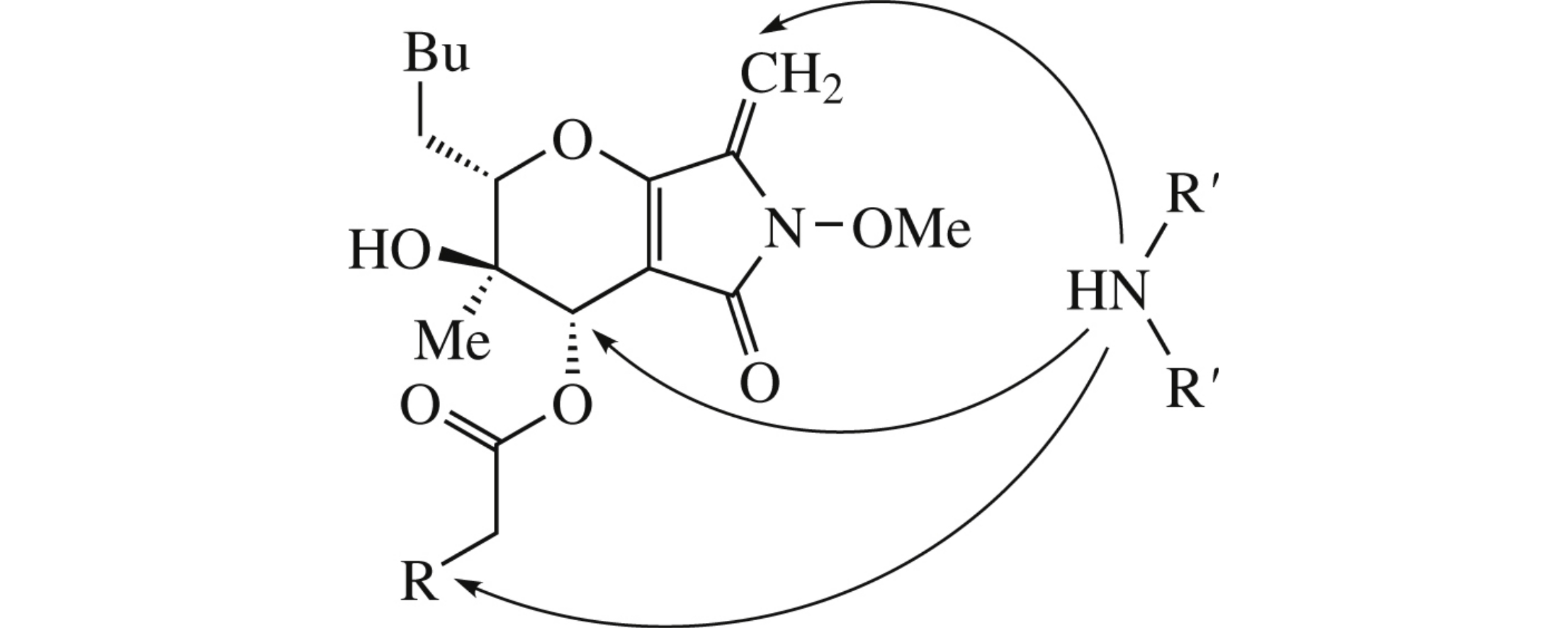 6-O-Acylated phaeosphaeride A and phaeosphaeride B in reaction with secondary cyclic amines undergo stereospecific replacement of acyloxy group by pharmacophoric amino moiety. In case of chloroacetoxy derivative, chlorine displacement by such amines proceeds in the presence of triethylamine.