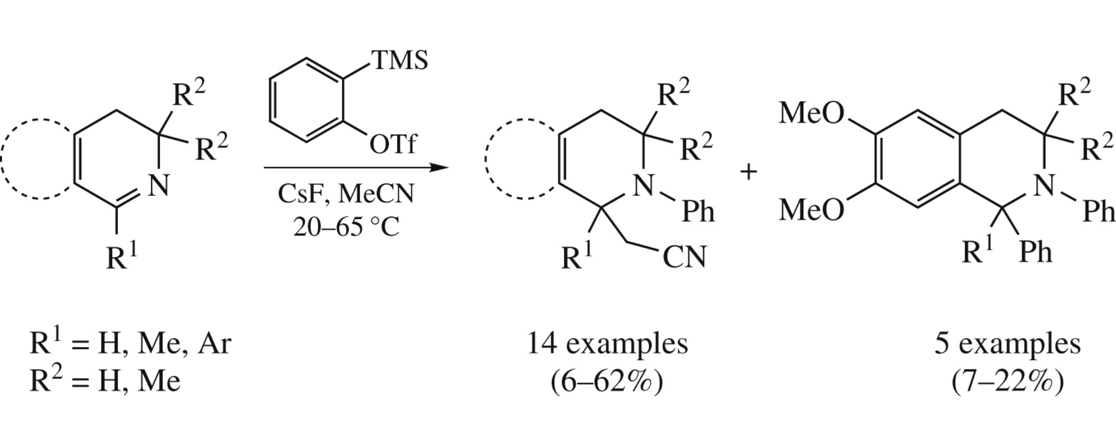 Cyanomethyl-substituted tetrahydroisoquinolines and tetrahydrothieno[3,2-c]pyridines were synthesized by multicomponent reaction of the dihydro analogues of aforesaid systems with benzyne and acetonitrile. The products obtained relate to alkaloids of isoquinoline family of 1,2,3,4-tetrahydro level.