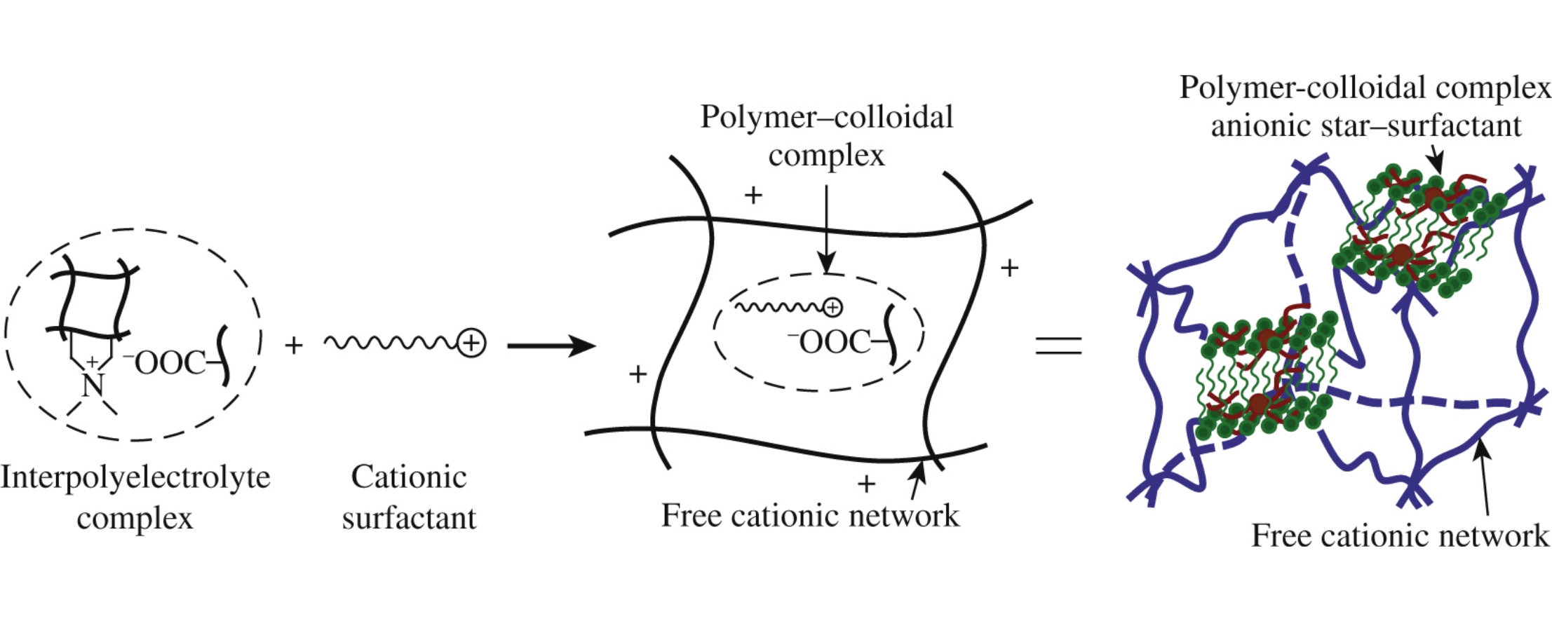 Cationic surfactants can replace a network of the same charge inside the interpolyelectrolyte complex with a star-shaped polyanion with the formation of a composite of polymer-colloidal particles distributed in a polycationic network.