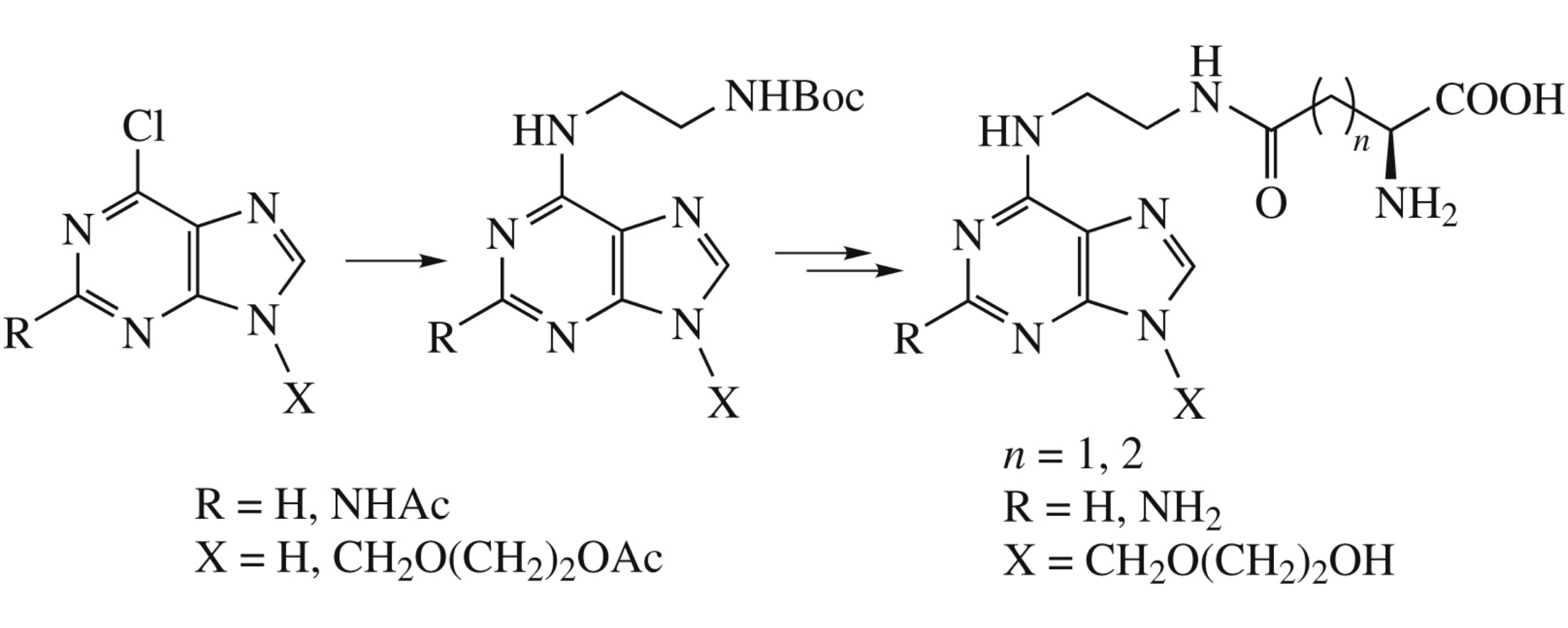 Novel purine and 2-aminopurine conjugates containing fragments of (S)-aspartic and (S)-glutamic acids with free α-functional groups attached via a 1,2-ethylenediamine linker at 6-position of the purine core, as well as their analogues with N9-(2-hydroxyethoxy)methyl substituent have been synthesized. Among the conjugates obtained, compounds exhibiting a significant antimycobacterial activity have been found.