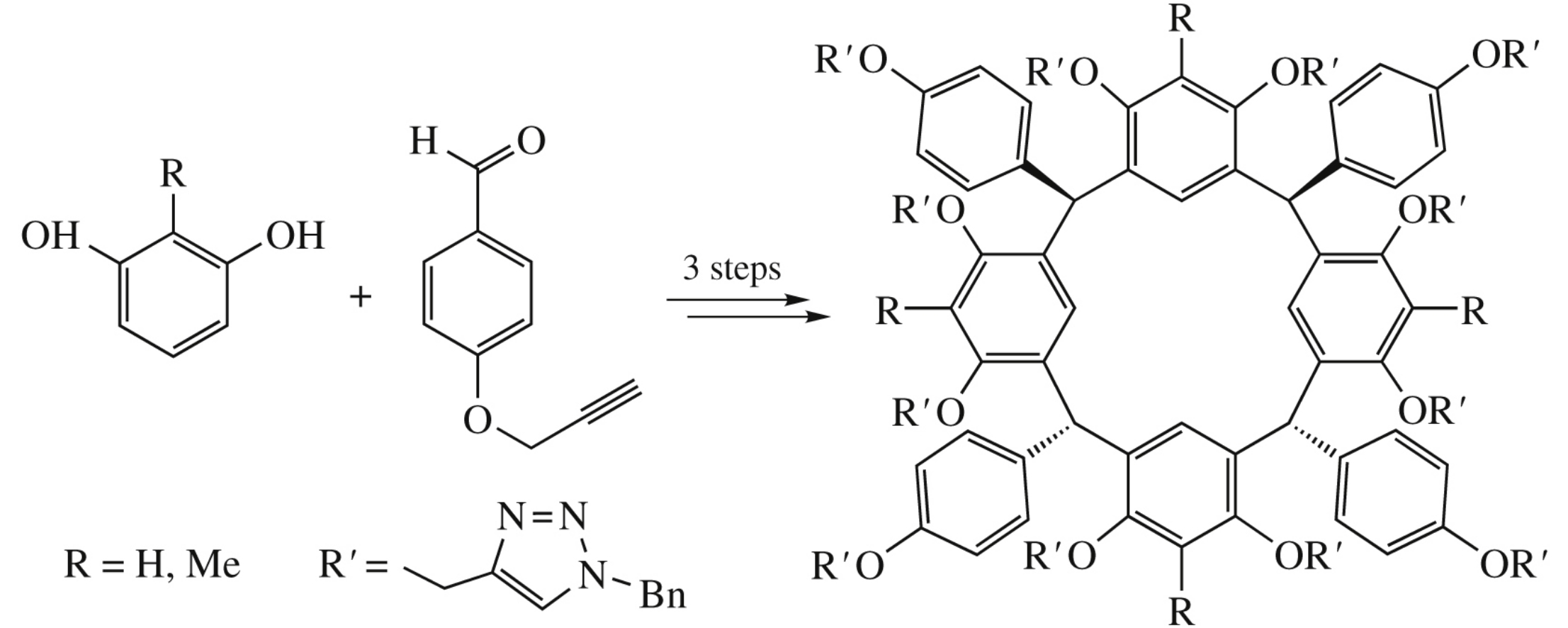A single-step acid-catalyzed condensation of resorcinol or 2-methylresorcinol with 4-(prop-2-yn-1-yloxy)benzaldehyde stereoselectively gives exclusively rctt-isomers of new calix[4]- resorcinols in chair conformation bearing four terminal alkyne groups at aromatic substituents. Further alkylation of free hydroxy groups with propargyl bromide affords new calix[4]- resorcinols containing 12 terminal alkyne groups. Subsequent click reaction of these compounds with benzyl azide results in highly functionalized calix[4]resorcinols with 12 triazole- linked branches.