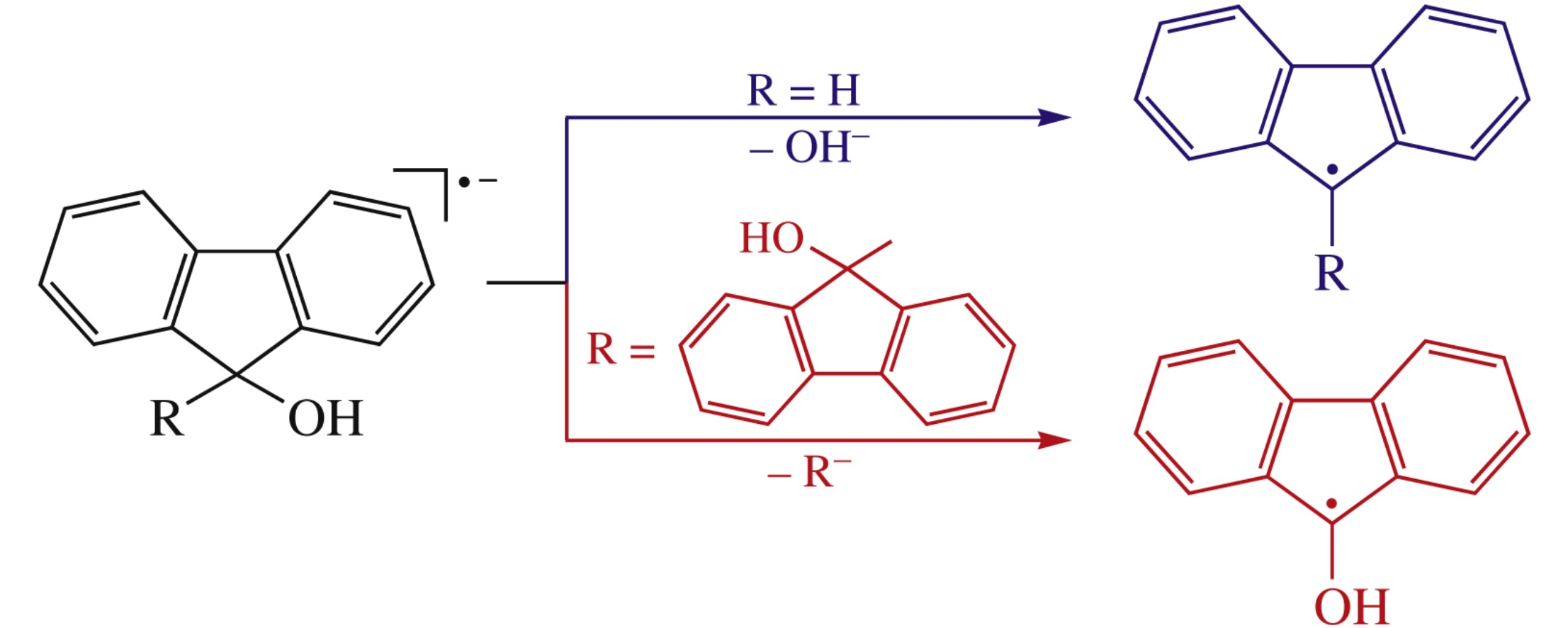 Cyclic voltammetry, digital simulation and quantum chemical methods were applied to study the electroreduction mechanism of vicinal hydroxyl derivatives using 9H,9’H-bifluorene- 9,9’-diol as an example. Unlike the case of fluoren-9-ol, dissociation of the C9–C9’ bond rather than the C9–OH one occurs in radical anion of the substrate, similarly to that in radical cations formed upon oxidation of vicinal hydroxyl derivatives.