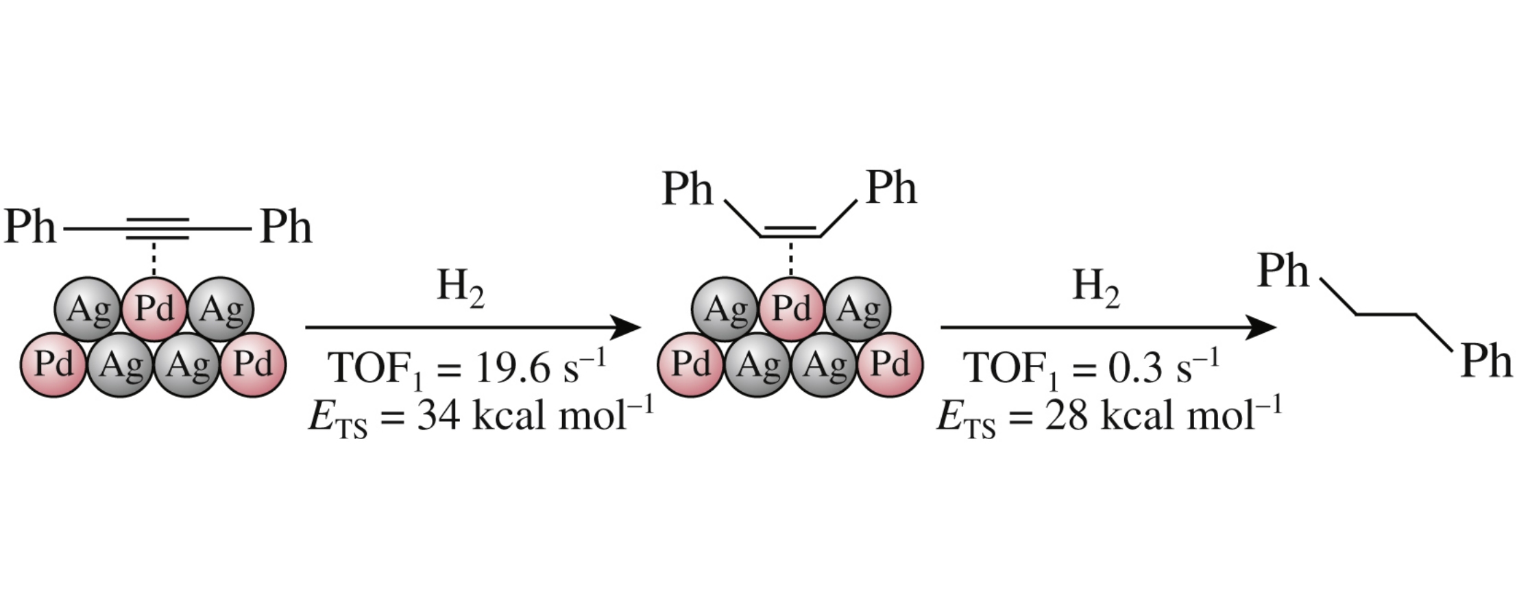 The hydrogenation of diphenylacetylene (DPA) on palladium–silver catalysts with a single-atom structure was investigated. It has been shown experimentally that the reaction rate of alkene to alkane hydrogenation is substantially lower than the rate of DPA semi-hydrogenation. The kinetic barriers of all stages of hydrogenation were calculated by the DFT method.