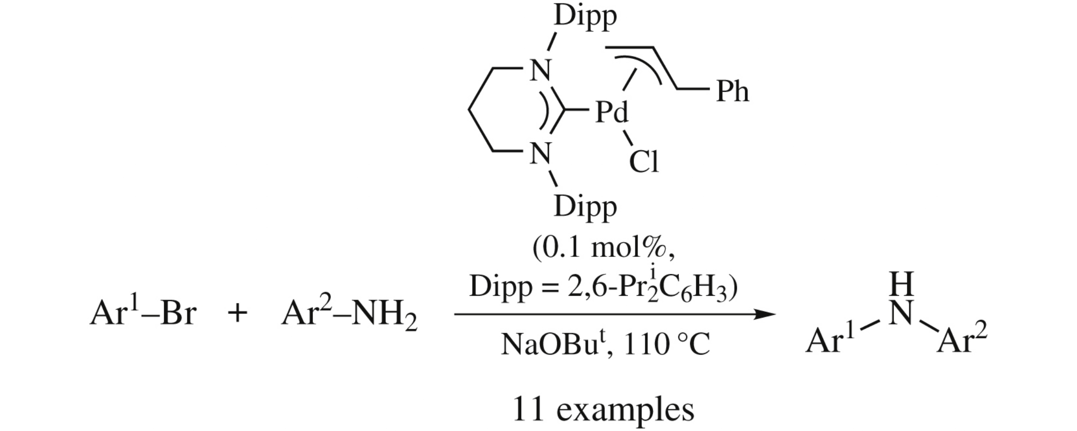 A highly efficient ‘green’ solvent-free monoarylation of primary anilines with aryl bromides mediated by the expanded-ring N-heterocyclic carbene palladium complex (THP-Dipp)Pd(cinn)Cl [THP-Dipp is 1,3-bis(2,6-diisopropylphenyl)-3,4,5,6-tetrahydropyrimidin-2-ylidene; cinn is cinnamyl] can be performed at low catalyst loadings (0.1 mol%) to provide excellent yields and remarkable selectivities for various substrates.