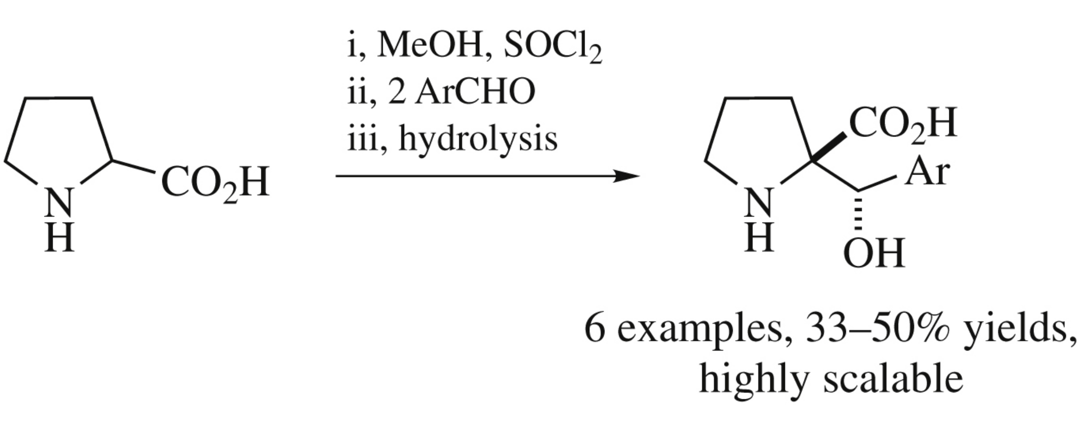 2-Oxapyrrolizidines formed in reactions of methyl prolinate with two molecules of aromatic aldehyde upon gradual hydrolysis give α-(α-hydroxybenzyl)prolines. The products are preferentially formed as one diastereomer (91–100%) in overall yield 33–50% (five stages starting from proline).