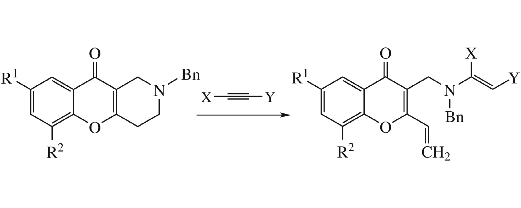 2-Vinyl substituted chromones were obtained by the reaction between 1,2,3,4-tetrahydrochromeno[3,2-c]pyridines and electron-deficient alkynes.