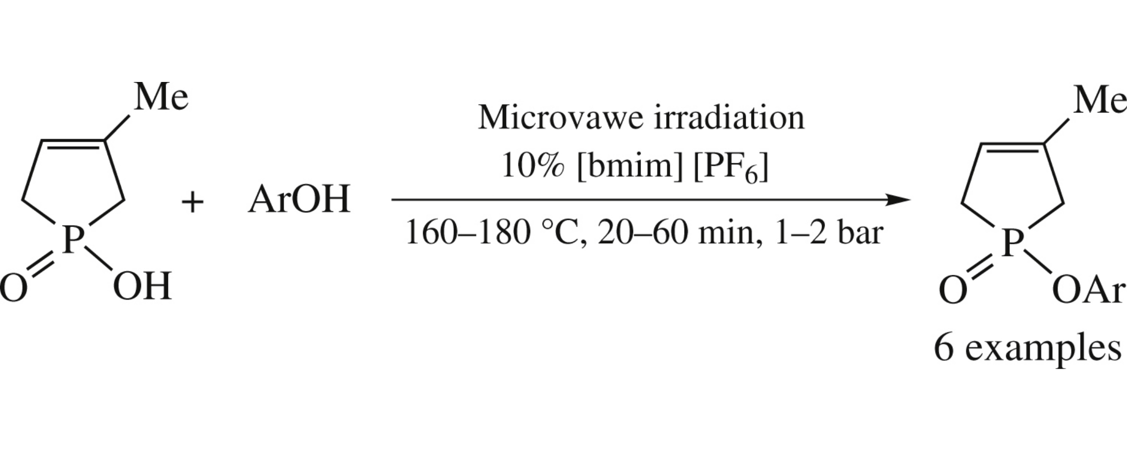 The direct esterification of 1-hydroxy-3-methyl-3-phospholene 1-oxide with substituted phenols under microwave irradiation in the presence of 10% of [bmim][PF6] affords the corresponding aryl phosphinates in 52–64% yields.