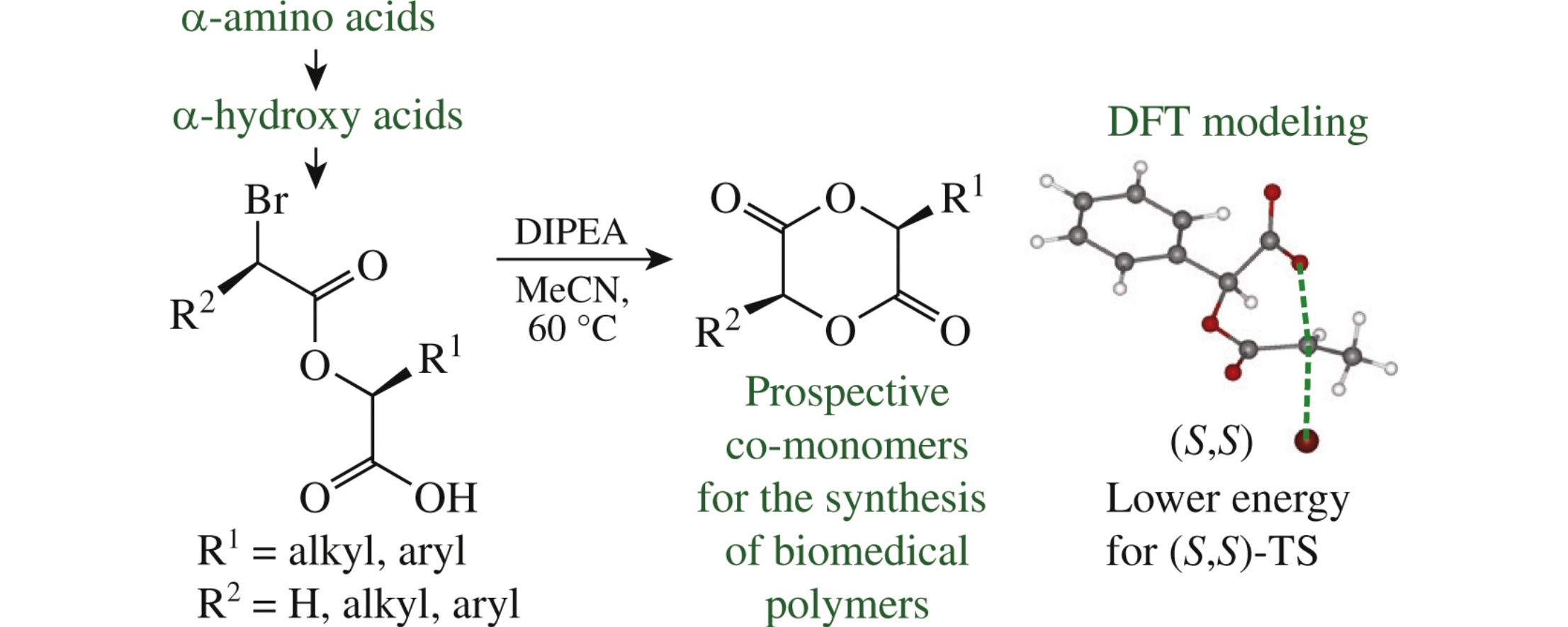 Intramolecular cyclization of α-bromoacyl derivatives of α-hydroxy acids affords 1,4-dioxane-2,5-diones. The method is suitable to obtain mono- and disubstituted products, the latter being formed stereoselectively as (S,S)-diastereomers, as confirmed by DFT modeling.