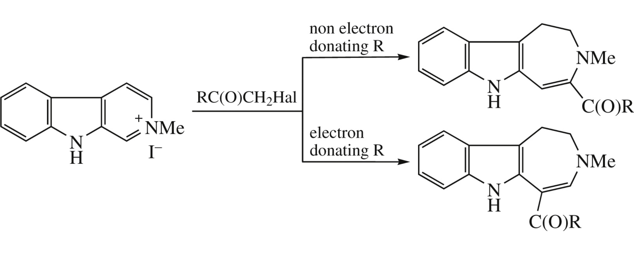 2-Methyl-3,4-dihydro-β-carbolin-2-ium iodide in the reaction with aryl halomethyl ketones is converted into 4- or/and 5-acyl-1,2-dihydroazepino[4,5-b]indoles depending on the electron donating effect of substituents in the aryl moiety of the halomethyl ketone.