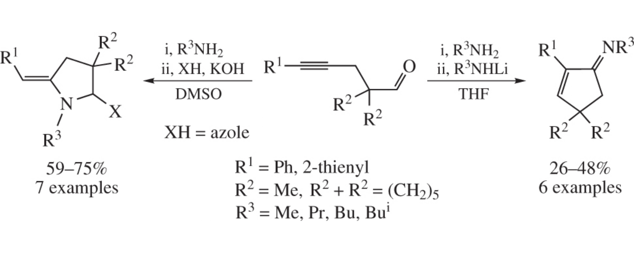 One-pot cyclization of alk-4-ynals with primary aliphatic amines and azoles in DMSO under the action of KOH affords 1-alkyl-2-azolyl-5-arylmethylidenepyrrolidines. Similar processes with lithium monoalkylamides in THF give rise to 3-iminocyclopentenes.