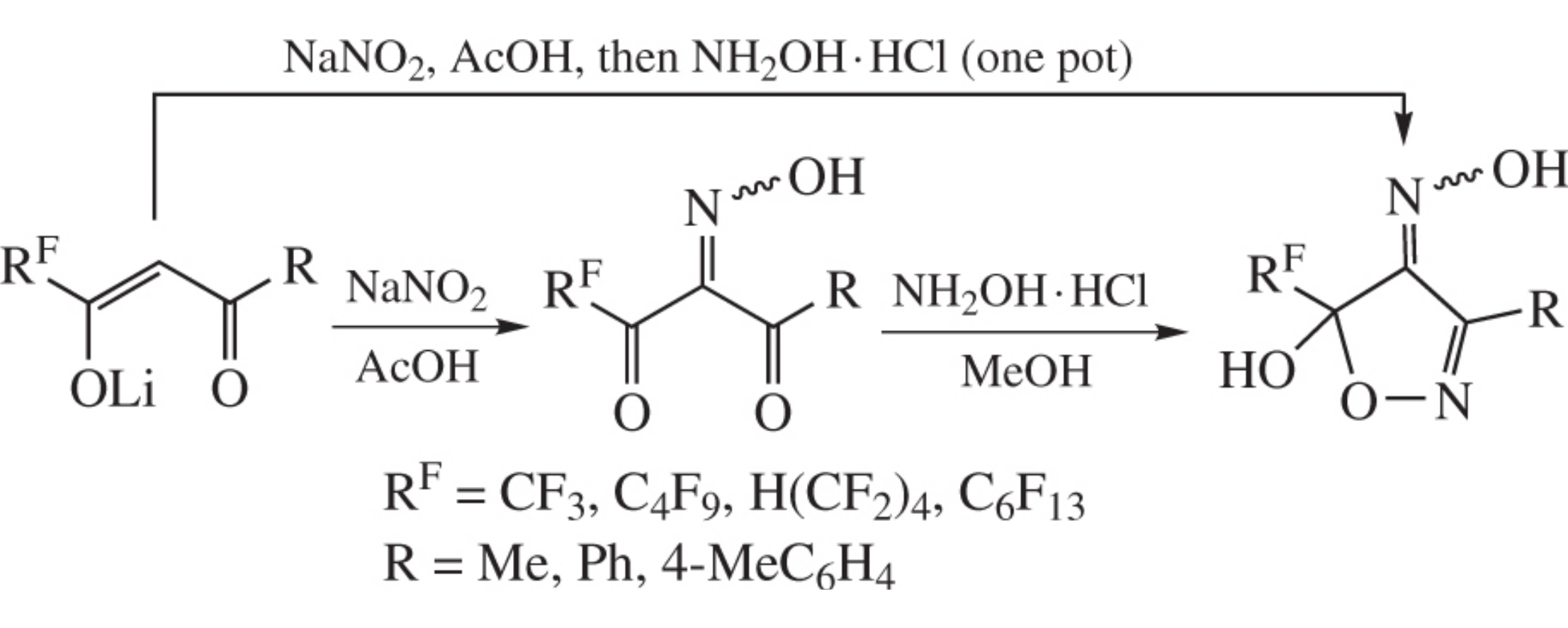 5-Hydroxy-5-(polyfluoroalkyl)isoxazol-4(5H)-one oximes have been obtained by nitrosation of lithium 3-polyfluoroalkyl-1,3-diketonates followed by treatment of intermediate 3-(poly-fluoroalkyl)propane-1,2,3-trione 2-oximes with hydroxylamine hydrochloride. The one-pot protocol comprising both stages has been elaborated.