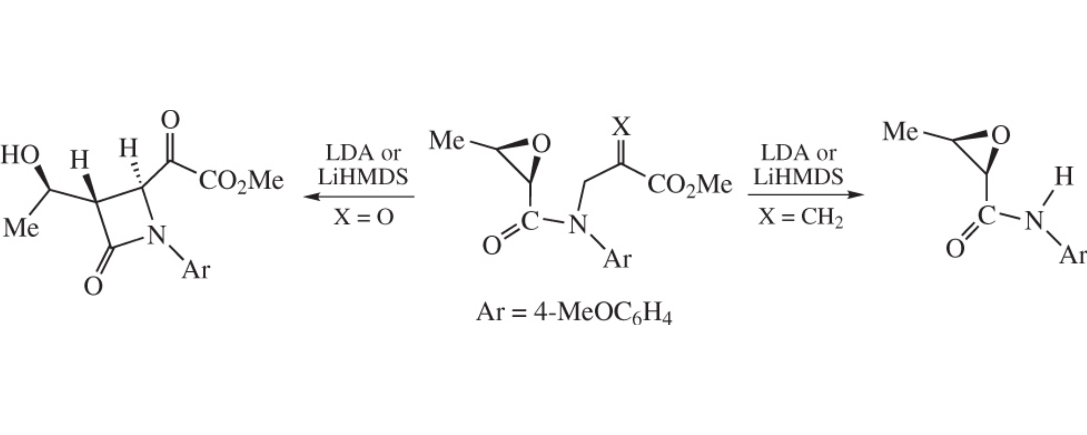 (2R,3R)-N-(3-Methoxy-2,3-dioxopropyl)-N-(4-methoxy-phenyl)-2,3-epoxybutanamide on treatment with strong bases (LDA, LHMDS) gives 3-[(1R)-1-hydroxyethyl]azetidin-2-one derivative, while the N-(3-methoxy-2-methylidene-3-oxo-propyl) analogue undergoes fragmentation.