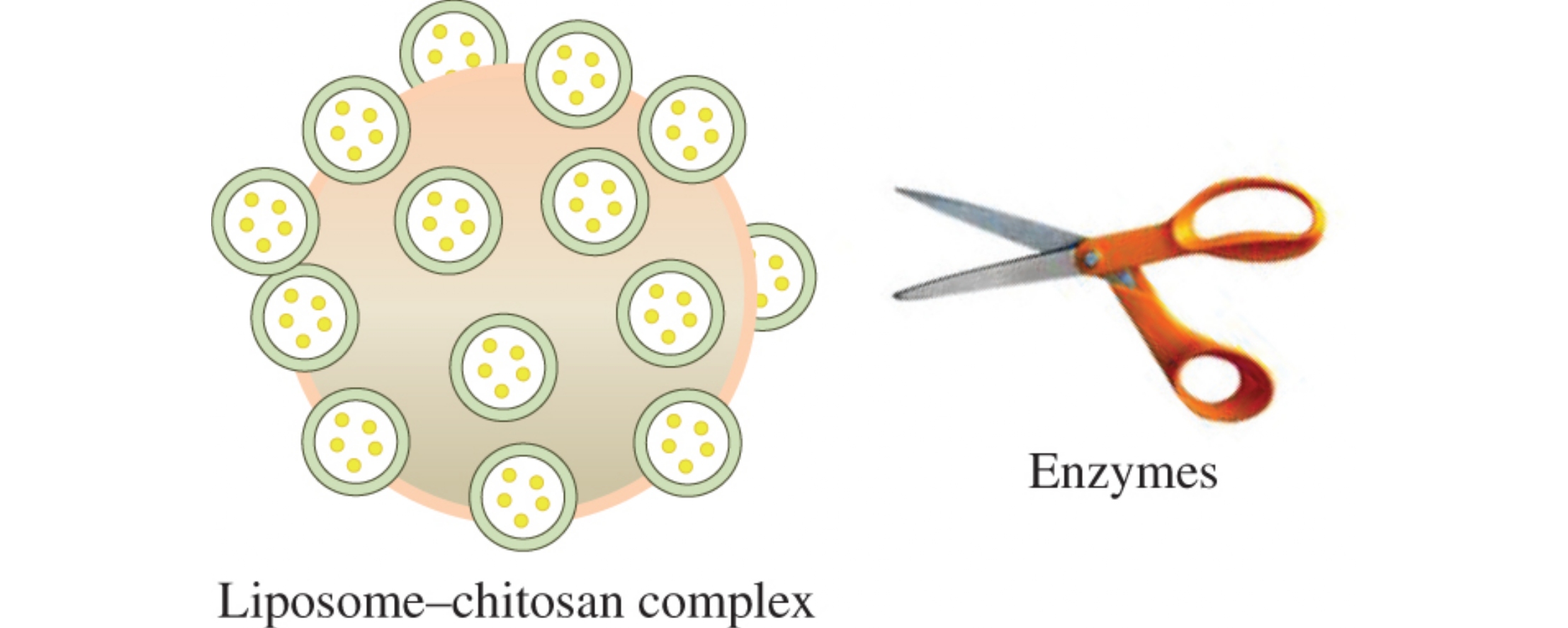 Multi-liposomal containers were prepared via electrostatic adsorption of 50 nm anionic liposomes on the surface of cationic chitosan nanoparticles (nanogels) 270 nm in diameter. The containers are stable in aqueous-salt solutions but degrade in the presence of proteolytic enzymes down to 10–15 nm particles and release water-soluble substances encapsulated into the adsorbed liposomes. Based on the kinetic data, the mechanism of the release is discussed.
