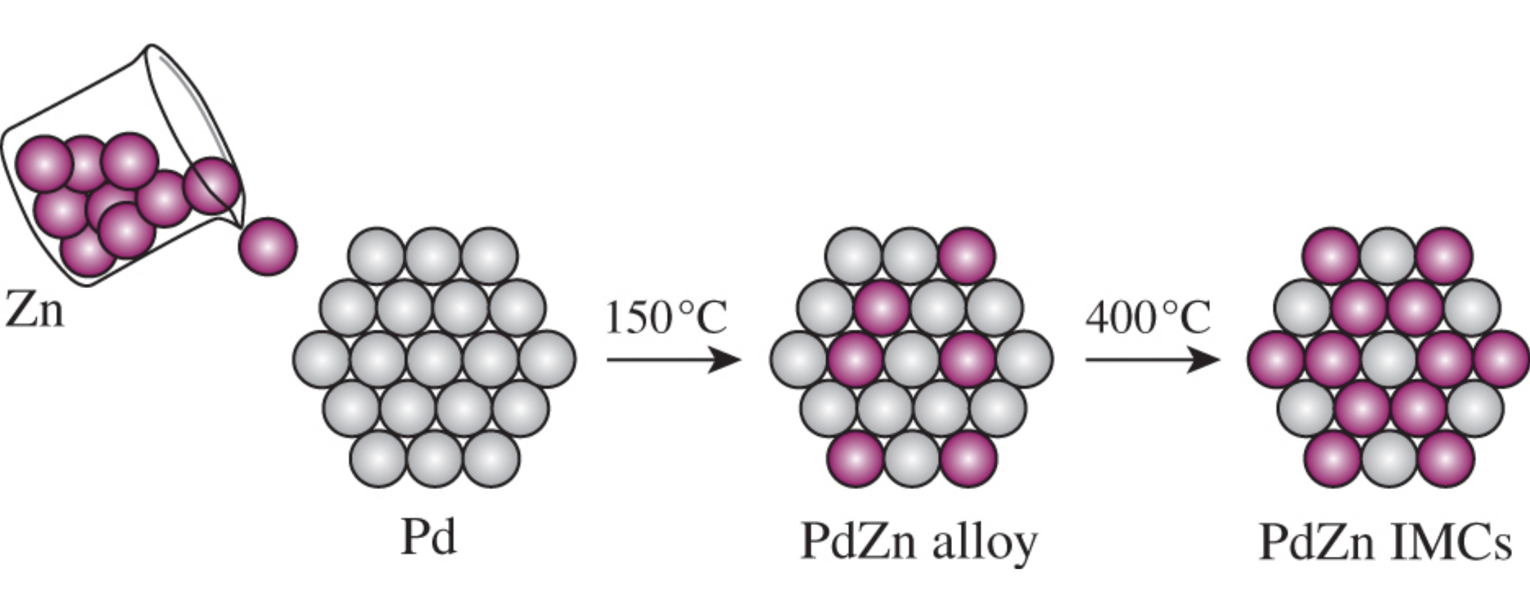 The complex characterization of a PdZn /Al2O3 catalyst by XPS, XRD, TEM and H2-TPD techniques revealed the route of solid-state alloy → intermetallics transformation. The influence of this transformation on the performance of PdZn /Al2O3 in the liquid-phase hydrogenation of diphenylacetylene was estimated.