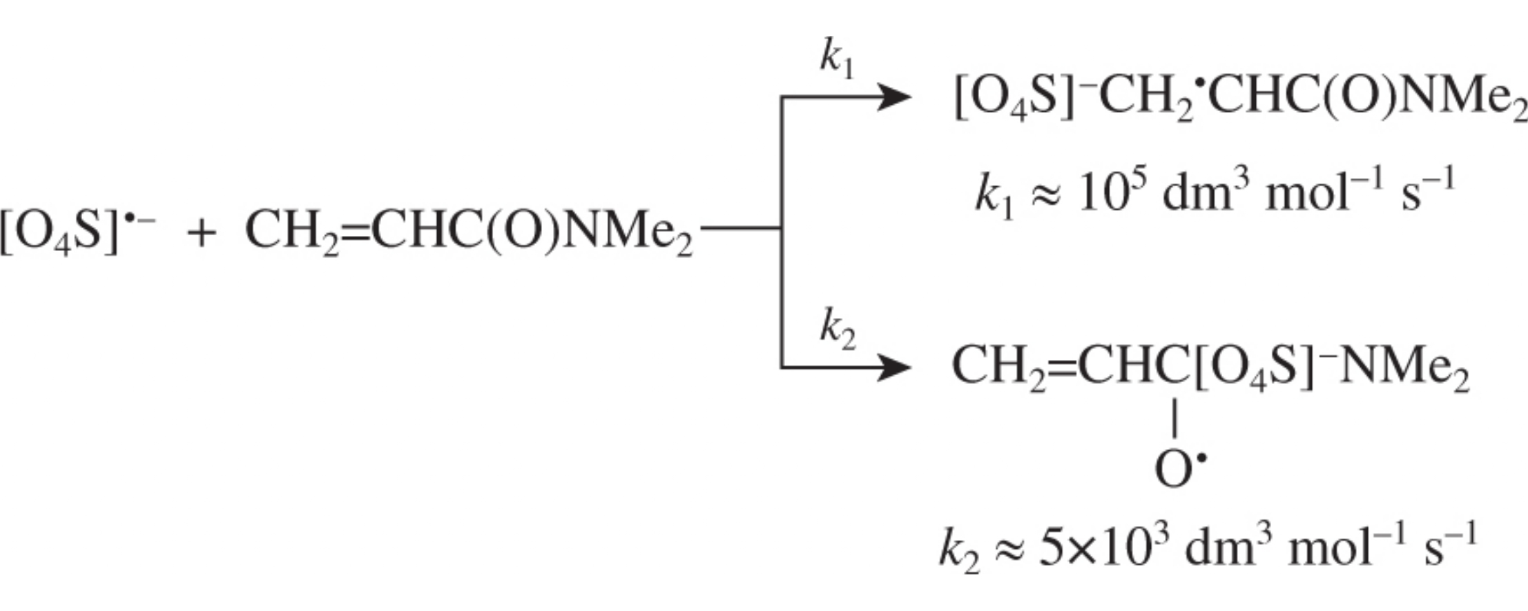 The rate constants for addition of the radical anion [O4S]•– at C=C and C=O double bonds of N,N-dimethylacrylamine have been evaluated by the electron paramagnetic resonance technique.