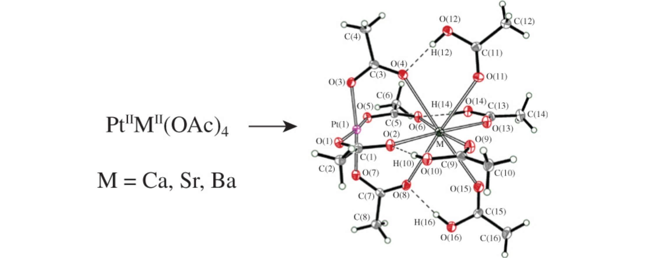 The first platinum(ii)–alkaline-earth acetate-bridged complexes Ptii(m-OAc)4Mii(AcOH)4 (M = Ca, Sr, Ba) were synthesized, structurally characterized using single-crystal synchrotron radiation X-ray diffraction analysis and tested for catalytic performance in homogeneous styrene hydrogenation under mild conditions.