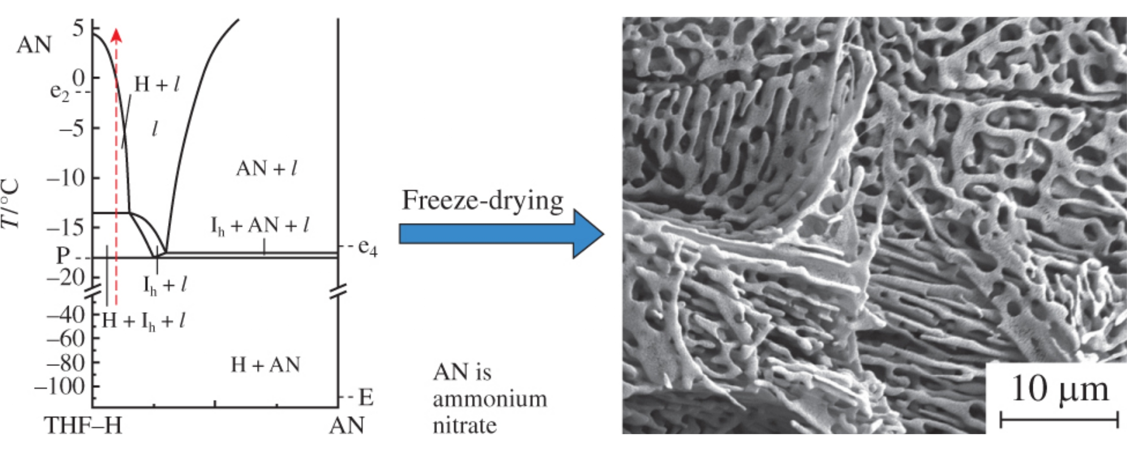 Fine powders of ammonium nitrate were prepared by the freeze-drying of a solution in a THF–water mixture. Freezing gives a THF hydrate and dispersed ammonium nitrate particles; the THF hydrate can be then removed by sublimation to leave fine ammonium nitrate powder. To optimize the process, the stability of cubic structure II THF clathrate hydrate in the presence of ammonium nitrate was studied by X-ray diffraction and thermal analysis.